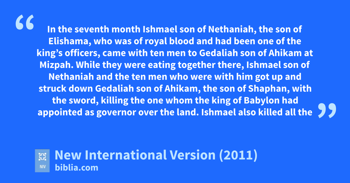 41 In the seventh month Ishmaelx son of Nethaniah, the son of Elishama, who was of royal blood and had been one of the king’s officers, came with ten men to Gedaliah son of Ahikam at Mizpah. While they were eating together there, 2 Ishmaely son of Nethaniah and the ten men who were with him got up and struck down Gedaliah son of Ahikam, the son of Shaphan, with the sword,z killing the one whom the king of Babylon had appointeda as governor over the land.b 3 Ishmael also killed all the men of Judah who were with Gedaliah at Mizpah, as well as the Babyloniana soldiers who were there.