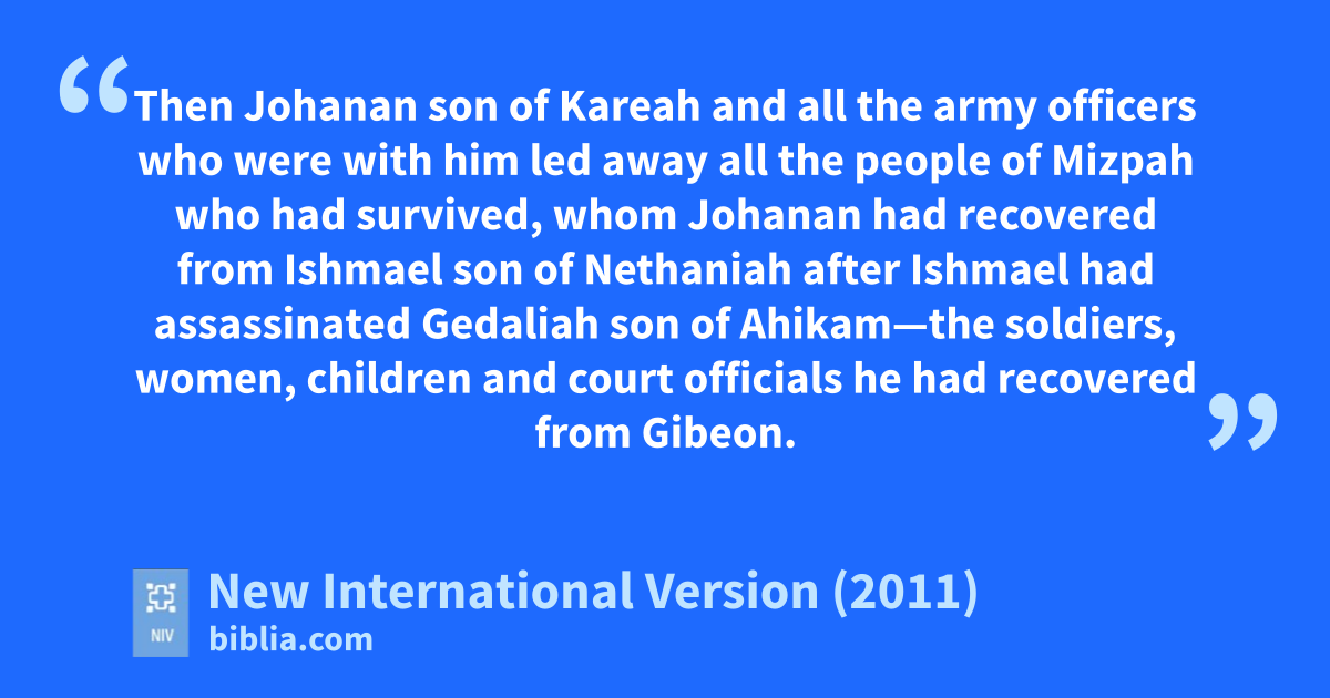 16 Then Johanan son of Kareah and all the army officersa who were with him led away all the people of Mizpah who had survived,b whom Johanan had recovered from Ishmael son of Nethaniah after Ishmael had assassinated Gedaliah son of Ahikam—the soldiers, women, children and court officials he had recovered from Gibeon. 17 And they went on, stopping at Geruth Kimhamc near Bethlehemd on their way to Egypte 18 to escape the Babylonians.b They were afraidf of them because Ishmael son of Nethaniah had killed Gedaliahg son of Ahikam, whom the king of Babylon had appointed as governor over the land.
