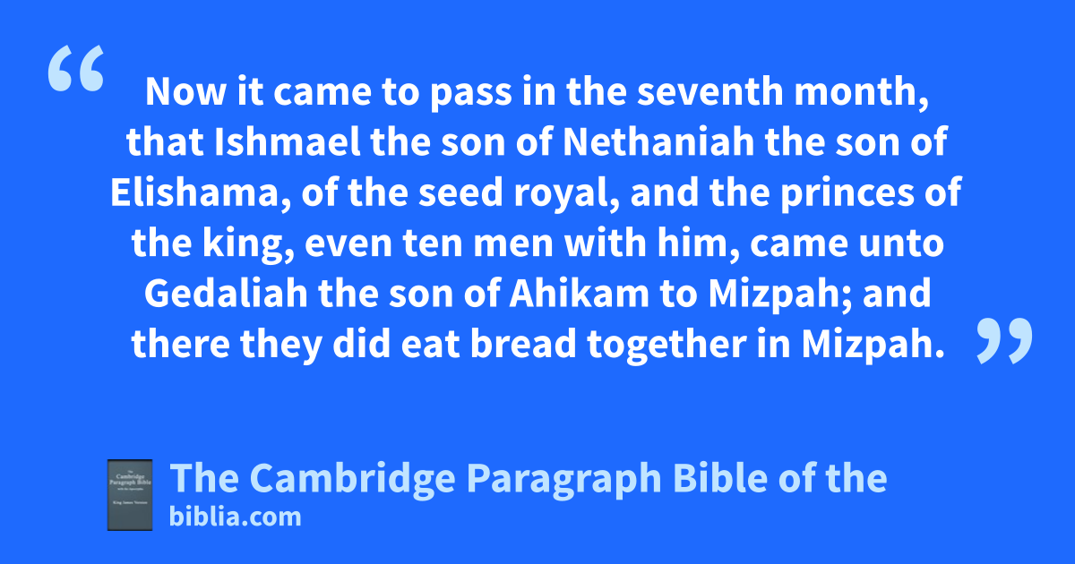 XLI. Now it came to pass ain the seventh month, bthat cIshmael the son of Nethaniah the son of dElishama, of the seed royal, and the princes of the king, even ten men with him, came unto Gedaliah the son of Ahikam to cMizpah; and there ethey did eat bread together in Mizpah. 2 bThen arose Ishmael the son of Nethaniah, and the ten men that were with him, and smote Gedaliah the son of Ahikam the son of Shaphan with the sword, and slew him, fwhom the king of Babylon had made governor over the land. 3 Ishmael also slew all bthe Jews that were with him, even with Gedaliah at Mizpah, and bthe Chaldeans that were found there, and the men of war.