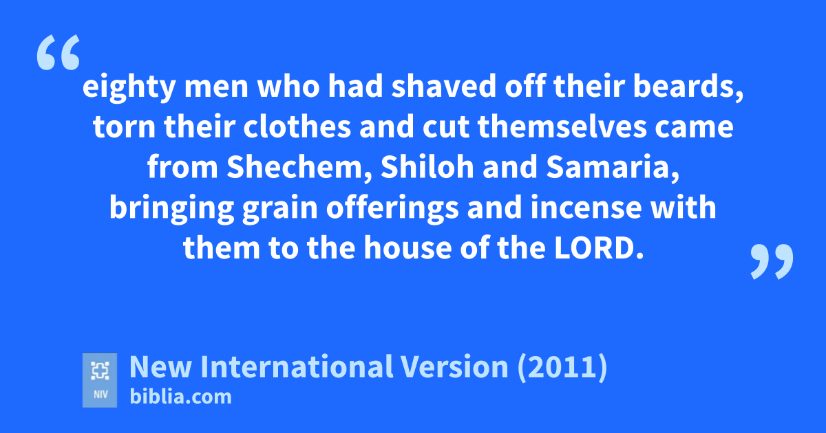 4 The day after Gedaliah’s assassination, before anyone knew about it, 5 eighty men who had shaved off their beards,c torn their clothesd and cute themselves came from Shechem,f Shilohg and Samaria,h bringing grain offerings and incensei with them to the house of the Lord.j 6 Ishmael son of Nethaniah went out from Mizpah to meet them, weepingk as he went. When he met them, he said, “Come to Gedaliah son of Ahikam.”l 7 When they went into the city, Ishmael son of Nethaniah and the men who were with him slaughtered them and threw them into a cistern.m 8 But ten of them said to Ishmael, “Don’t kill us! We have wheat and barley, olive oil and honey, hidden in a field.”n So he let them alone and did not kill them with the others. 9 Now the cistern where he threw all the bodies of the men he had killed along with Gedaliah was the one King Asao had made as part of his defensep against Baashaq king of Israel. Ishmael son of Nethaniah filled it with the dead.