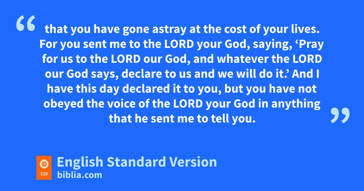 18 “For thus says the Lord of hosts, the God of Israel: dAs my anger and my wrath were poured out on the inhabitants of Jerusalem, so my wrath will be poured out on you when you go to Egypt. eYou shall become an execration, a horror, a curse, and a taunt. You shall see this place no more. 19 The Lord has said to you, O remnant of Judah, f‘Do not go to Egypt.’ gKnow for a certainty that I have warned you this day 20 that you have gone astray at the cost of your lives. hFor you sent me to the Lord your God, saying, h‘Pray for us to the Lord our God, and iwhatever the Lord our God says, declare to us and we will do it.’ 21 And I have this day declared it to you, but you have not obeyed the voice of the Lord your God in anything jthat he sent me to tell you. 22 kNow therefore know for a certainty that you shall die by the sword, by famine, and by pestilence in the place where you desire to go to live.”