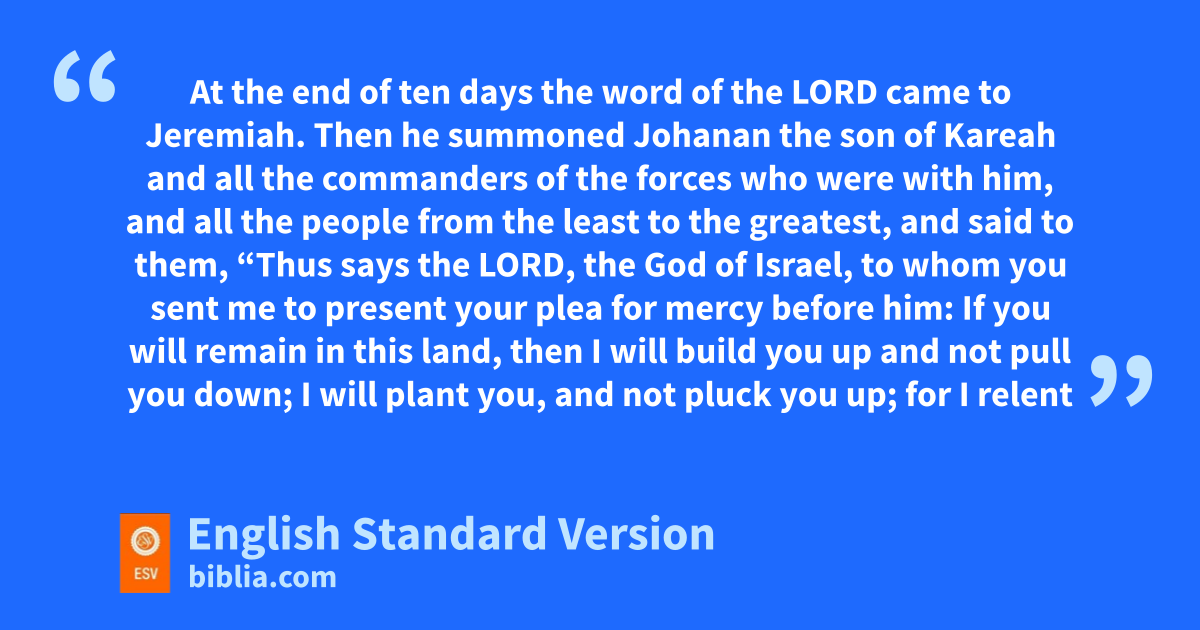 7 nAt the end of ten days the word of the Lord came to Jeremiah. 8 Then he summoned zJohanan the son of Kareah and yall the commanders of the forces who were with him, and all the people bfrom the least to the greatest, 9 and said to them, “Thus says the Lord, the God of Israel, oto whom you sent me to present your plea for mercy before him: 10 If you will remain in this land, pthen I will build you up and not pull you down; I will plant you, and not pluck you up; qfor I relent of the disaster that I did to you. 11 rDo not fear the king of Babylon, rof whom you are afraid. sDo not fear him, declares the Lord, sfor I am with you, to save you and to deliver you from his hand. 12 tI will grant you mercy, that he may have mercy on you and let you remain in your own land. 13 uBut if you say, ‘We will not remain in this land,’ disobeying the voice of the Lord your God 14 and saying, ‘No, vwe will go to the land of Egypt, where we shall not see war or whear the sound of the trumpet or xbe hungry for bread, and we will dwell there,’ 15 then hear the word of the Lord, O remnant of Judah. Thus says the Lord of hosts, the God of Israel: yIf you set your faces to enter Egypt zand go to live there, 16 then the sword athat you fear shall overtake you there in the land of Egypt, and the famine of which you are afraid shall follow close after you to Egypt, band there you shall die. 17 All the men who set their faces to go to Egypt to live there shall die by the sword, by famine, and by pestilence. They shall have cno remnant or survivor from the disaster that I will bring upon them.
