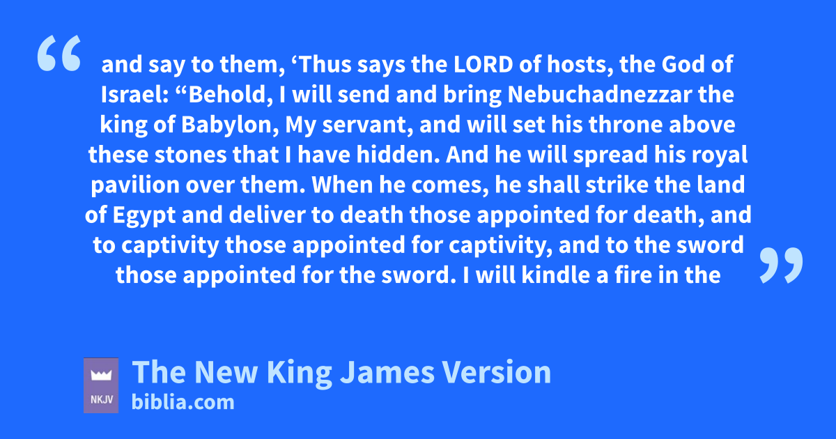 8 Then the jword of the Lord came to Jeremiah in Tahpanhes, saying, 9 “Take large stones in your hand, and hide them in the sight of the men of Judah, in the 2clay in the brick courtyard which is at the entrance to Pharaoh’s house in Tahpanhes; 10 and say to them, ‘Thus says the Lord of hosts, the God of Israel: “Behold, I will send and bring Nebuchadnezzar the king of Babylon, kMy servant, and will set his throne above these stones that I have hidden. And he will spread his royal pavilion over them. 11 lWhen he comes, he shall strike the land of Egypt and deliver to death mthose appointed for death, and to captivity those appointed for captivity, and to the sword those appointed for the sword. 12 3I will kindle a fire in the houses of nthe gods of Egypt, and he shall burn them and carry them away captive. And he shall array himself with the land of Egypt, as a shepherd puts on his garment, and he shall go out from there in peace. 13 He shall also break the sacred pillars of 4Beth Shemesh that are in the land of Egypt; and the houses of the gods of the Egyptians he shall burn with fire.” ’ ”