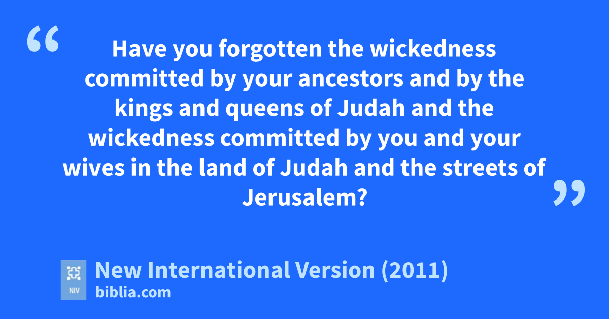 20 Then Jeremiah said to all the people, both men and women, who were answering him, 21 “Did not the Lord rememberk and call to mind the incensel burned in the towns of Judah and the streets of Jerusalemm by you and your ancestors,n your kings and your officials and the people of the land?o 22 When the Lord could no longer endurep your wicked actions and the detestable things you did, your land became a curseq and a desolate waster without inhabitants, as it is today.s 23 Because you have burned incense and have sinned against the Lord and have not obeyed him or followedt his law or his decreesu or his stipulations, this disasterv has come upon you, as you now see.”w