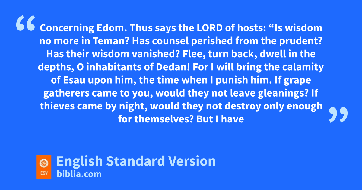 17 h“Edom shall become a horror. iEveryone who passes by it will be horrified iand will hiss because of all its disasters. 18 jAs when Sodom and Gomorrah and their kneighboring cities were overthrown, says the Lord, lno man shall dwell there, lno man shall sojourn in her. 19 mBehold, nlike a lion coming up from othe jungle of the Jordan against a perennial pasture, I will suddenly make him4 run away from her. And I will appoint over her whomever I choose. pFor who is like me? qWho will summon me? rWhat shepherd can stand before me? 20 Therefore hear the plan that the Lord has made against sEdom and the purposes that he has formed against the inhabitants of tTeman: uEven the little ones of the flock shall be dragged away. Surely their fold shall be appalled at their fate. 21 At the sound of their fall vthe earth shall tremble; the sound of their cry shall be heard at the Red Sea. 22 Behold, wone shall mount up and fly swiftly like an eagle and spread his wings against xBozrah, and the heart of the warriors of Edom shall be in that day like the heart yof a woman in her birth pains.”
