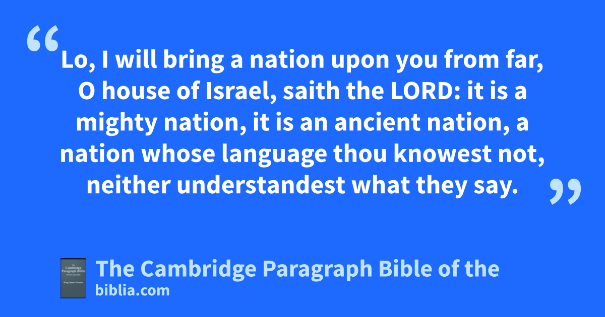 10 gGo ye up upon her walls, and destroy; but hmake not a full end: take away her ibattlements; for they are not the Lord’s. 11 For the house of Israel and the house of Judah khave dealt very treacherously against me, saith the Lord. 12 lThey have belied the Lord, and said, It is not he; neither shall evil come upon us; mneither shall we see sword nor famine: 13 and the prophets shall become nwind, and the word is not in them: thus shall it be done unto them. 14 Wherefore thus saith the Lord God of hosts, Because ye speak this word, behold, oI will make my words in thy mouth pfire, and this people pwood, and it shall devour them. 15 Lo, I will bring qa nation upon you rfrom far, O house of Israel, saith the Lord: it is sa mighty nation, it is an ancient nation, qa nation whose language thou knowest not, tneither understandest what they say. 16 uTheir quiver is as van open sepulchre, they are all mighty men. 17 And wthey shall eat up thine harvest, and thy bread, which thy sons and thy daughters should eat: they shall eat up thy flocks and thine herds: they shall eat up thy vines and thy fig trees: they shall impoverish thy xfenced cities, wherein thou trustedst, with the sword. 18 Nevertheless in those days, saith the Lord, I hwill not make a full end with you.