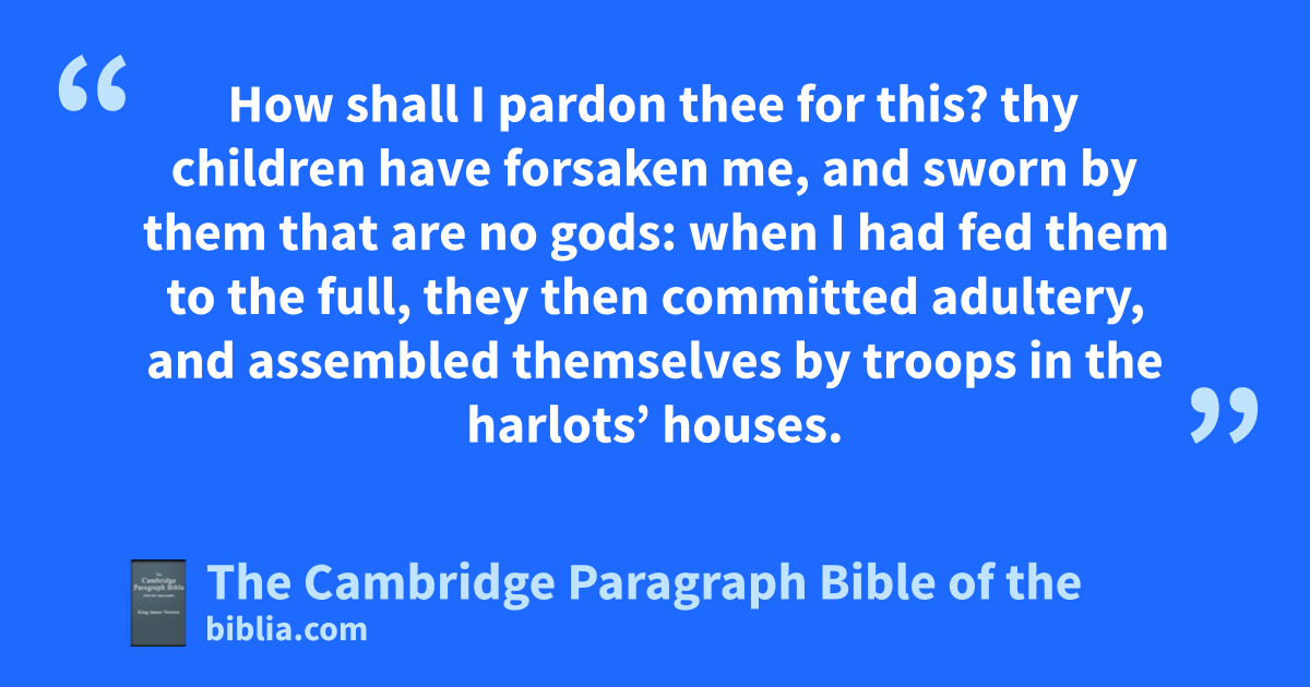 V. aRun ye to and fro through the streets of Jerusalem, and see now, and know, and bseek in the broad places thereof, cif ye can find a man, dif there be any that executeth judgment, that seeketh the truth; eand I will pardon it. 2 And fthough they say, gThe Lord liveth; hsurely ithey swear falsely. 3 O Lord, are not kthine eyes upon the truth? thou hast lmstricken them, but they have not mgrieved; thou hast consumed them, but nthey have refused to receive correction: othey have made their faces harder than a rock; oothey have refused to return. 4 Therefore I said, Surely these are poor; pthey are foolish: for qthey know not the way of the Lord, nor qthe judgment of their God. 5 I will get me unto the great men, and will speak unto them; for qthey have known the way of the Lord, and qthe judgment of their God: but rthese have altogether broken the yoke, and rrburst the bonds. 6 Wherefore sa lion tout of the forest shall slay them, and ua wolf of the * evenings shall spoil them, va leopard shall watch over their cities: every one that goeth out thence shall be torn in pieces: because their transgressions are many, and their wbackslidings * xare increased. 7 yHow shall I pardon thee for this? yythy children have forsaken me, and zsworn by athem that are no gods: bwhen I had fed them to the full, bbthey then committed adultery, and cassembled themselves by troops in the harlots’ houses. 8 They were as fed horses in the morning: every one dneighed eafter his neighbour’s wife. 9 fShall I not visit for these things? saith the Lord: and shall not my soul be avenged on such a nation as this?
