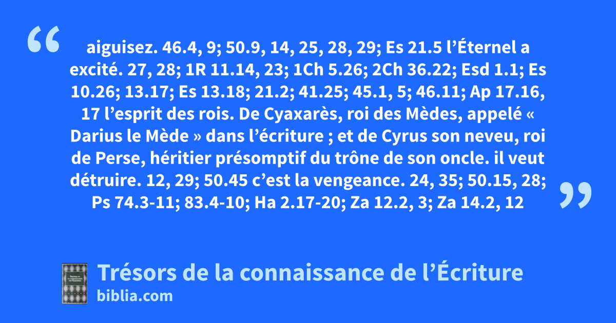 aiguisez. 46.4, 9; 50.9, 14, 25, 28, 29; Es 21.5 l’Éternel a excité. 27, 28; 1R 11.14, 23; 1Ch 5.26; 2Ch 36.22; Esd 1.1; Es 10.26; 13.17; Es 13.18; 21.2; 41.25; 45.1, 5; 46.11; Ap 17.16, 17 l’esprit des rois. De Cyaxarès, roi des Mèdes, appelé « Darius le Mède » dans l’écriture ; et de Cyrus son neveu, roi de Perse, héritier présomptif du trône de son oncle. il veut détruire. 12, 29; 50.45 c’est la vengeance. 24, 35; 50.15, 28; Ps 74.3-11; 83.4-10; Ha 2.17-20; Za 12.2, 3; Za 14.2, 12