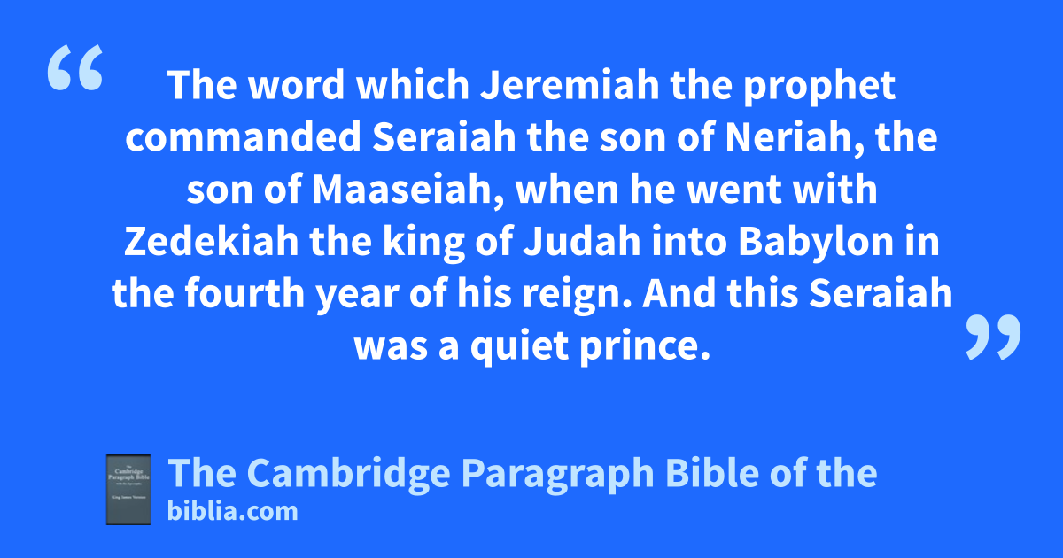 59 The word which Jeremiah the prophet commanded Seraiah tthe son of Neriah, the son of Maaseiah, when he went * with Zedekiah the king of Judah into Babylon uin the fourth year of his reign. And this Seraiah was va * quiet xprince. 60 So Jeremiah wrote in a book all the evil that should come upon Babylon, even yall these words that are written against Babylon. 61 And Jeremiah said to Seraiah, When thou comest to Babylon, and shalt see, and shalt read all these words; 62 then shalt thou say, O Lord, thou hast spoken against this place, to cut it off, zthat none shall remain in it, zneither man nor beast, but that it shall be * desolate for ever. 63 And it shall be, when thou hast made an end of reading this book, that athou shalt bind a stone to it, and cast it into the midst of Euphrates: 64 and thou shalt say, Thus shall Babylon bsink, and shall not rise from the evil that I will bring upon her: cand they shall be weary. dThus far are the words of Jeremiah.