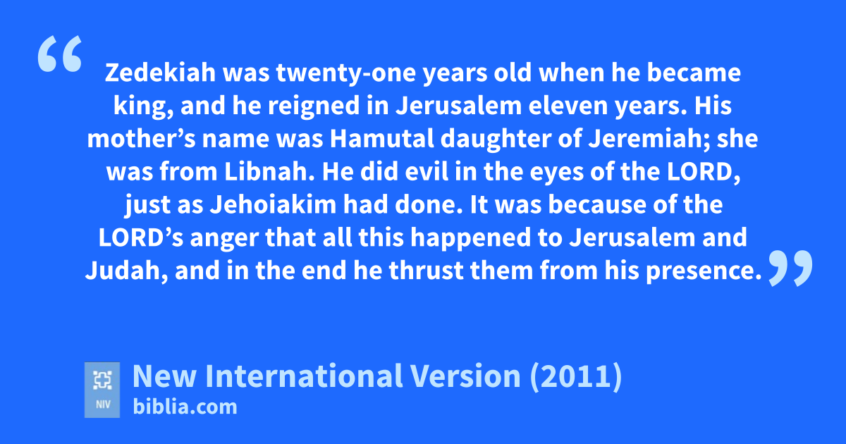 52 Zedekiahd was twenty-one years old when he became king, and he reigned in Jerusalem eleven years. His mother’s name was Hamutal daughter of Jeremiah; she was from Libnah.e 2 He did evil in the eyes of the Lord, just as Jehoiakimf had done. 3 It was because of the Lord’s anger that all this happened to Jerusalem and Judah,g and in the end he thrust them from his presence.h
