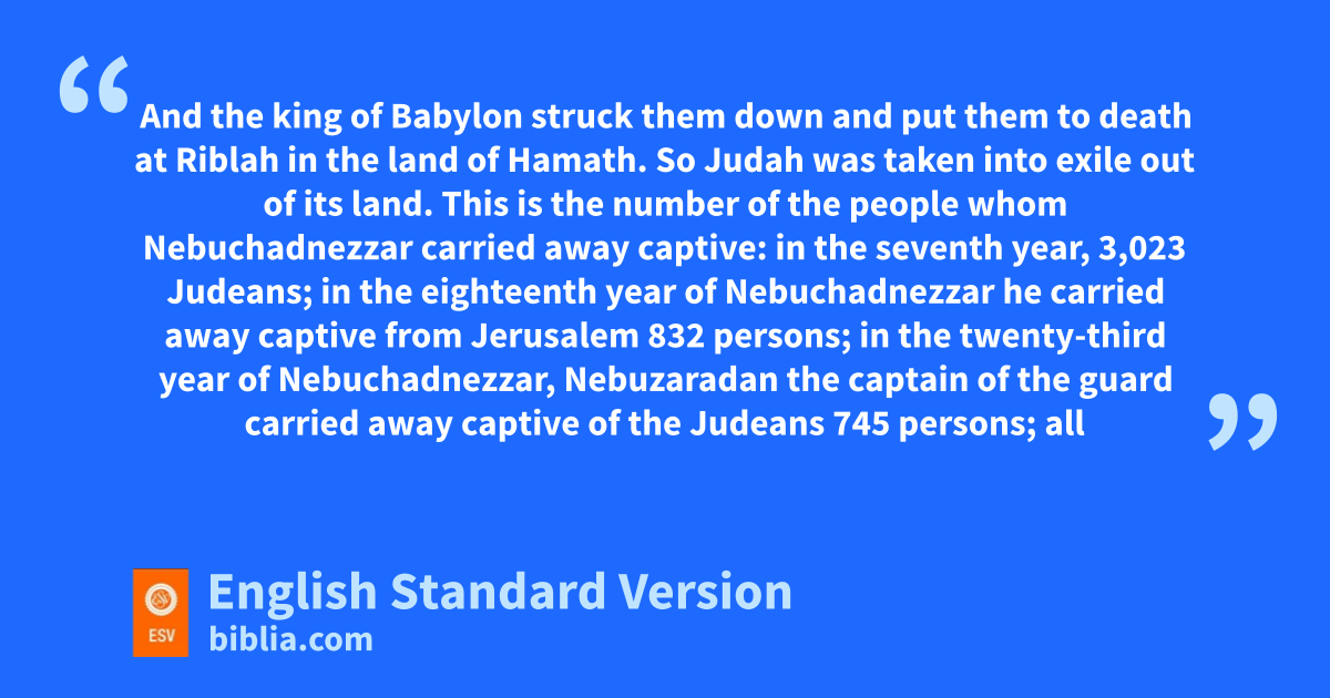 28 This is the number of the people whom Nebuchadnezzar carried away captive: ain the seventh year, 3,023 Judeans; 29 bin the eighteenth year of Nebuchadnezzar he carried away captive from Jerusalem 832 persons; 30 in the twenty-third year of Nebuchadnezzar, Nebuzaradan the captain of the guard carried away captive of the Judeans 745 persons; all the persons were 4,600.