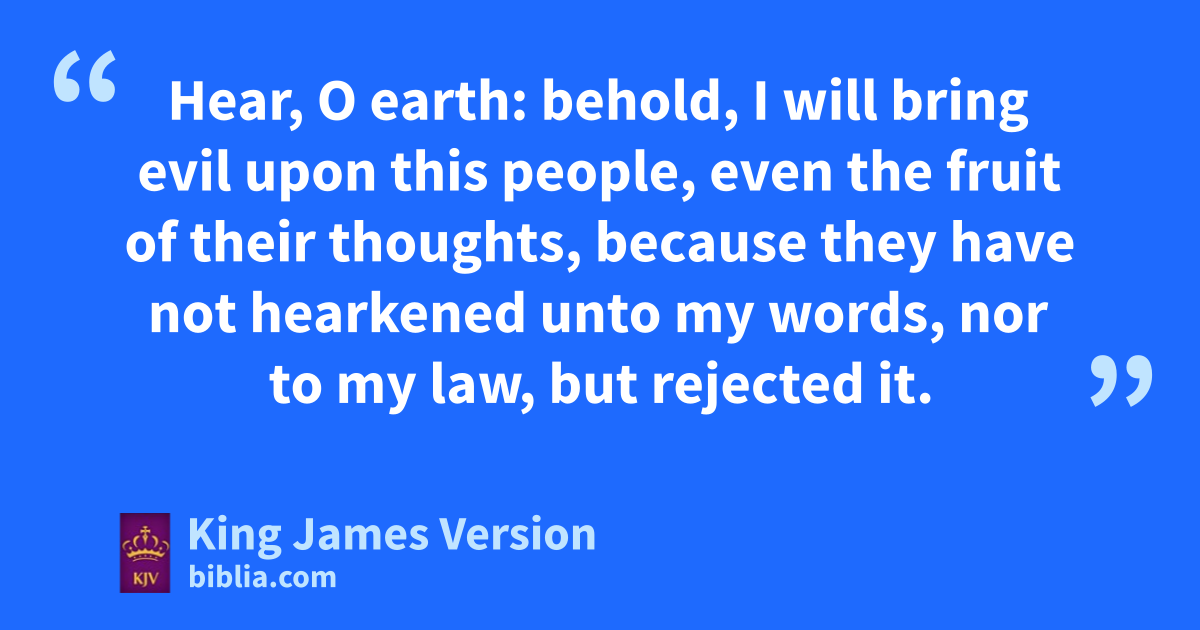 9 Thus saith the Lord of hosts, yThey shall throughly glean zthe remnant of Israel as a vine: turn back thine hand as a grapegatherer into the baskets. 10 aTo whom shall I speak, and give warning, that they may hear? behold, btheir ear is uncircumcised, and cthey cannot hearken: behold, dthe word of the Lord is unto them a reproach; they have no delight in it. 11 Therefore I am full of the fury of the Lord; eI am weary with holding in: I will pour it out fupon the children abroad, and upon gthe assembly of fhyoung men together: for even the husband with the wife ishall be taken, hthe aged with him that is full of days. 12 And kltheir houses shall be turned unto others, with their lfields and wives together: for I will stretch out my hand upon the inhabitants of the land, saith the Lord. 13 For mfrom the least of them even unto the greatest of them nevery one is given to covetousness; and ofrom the prophet even unto the priest every one dealeth falsely. 14 They have healed also the †hurt pof the daughter of my people slightly, qsaying, Peace, peace; when rthere is no peace. 15 sWere they ashamed when they had committed abomination? nay, tthey were not at all ashamed, neither could they blush: stherefore they shall fall among them that fall: at the time that I visit them they shall be cast down, saith the Lord. 16 Thus saith the Lord, Stand ye in the ways, and see, and ask for uthe old paths, where is the good way, and walk therein, vand ye shall find wrest for your souls. xBut they said, We will not walk therein. 17 Also I set xxwatchmen over you, ysaying, Hearken to the sound of zthe trumpet. But they said, We will not hearken. 18 Therefore hear, ye nations, and know, O congregation, what is among them. 19 aHear, O earth: behold, I will bring evil upon this people, even bthe fruit of their thoughts, because they have not hearkened unto my words, nor to my law, but rejected it. 20 cTo what purpose cometh there to me dincense from eSheba, and fthe sweet cane from a far country? gyour burnt offerings are not acceptable, nor your sacrifices sweet unto me. 21 Therefore thus saith the Lord, ggBehold, I will lay stumblingblocks before this people, and the fathers and the sons together shall fall upon them; the neighbour and his friend shall perish. 22 Thus saith the Lord, hBehold, a people cometh from ithe north country, and a great nation kshall be raised from the sides of the earth. 23 They shall lay hold on bow and lspear; they are mcruel, and nhave no mercy; otheir voice roareth like the sea; and they ride upon horses, set in array as men for war against thee, O daughter of Zion. 24 We have heard the fame thereof: pour hands wax feeble: anguish hath taken hold of us, and qpain, as of a woman in travail. 25 Go not forth into the field, nor walk by the way; for the sword of the enemy and rfear is on every side. 26 O daughter of my people, sgird thee with sackcloth, and twallow thyself uin ashes: make thee vmourning, as for an only son, most wbitter lamentation: for the spoiler shall suddenly come upon us. 27 I have set thee for xa tower and ya fortress among my people, that thou mayest know and ztry their way. 28 aThey are all grievous revolters, bwalking with slanders: they are cbrass and iron; they are all dcorrupters. 29 The bellows are burned, cthe lead is consumed of the fire; ethe founder melteth in vain: for fthe wicked are not plucked away. 30 g||Reprobate silver shall men call them, because the Lord hath rejected them.