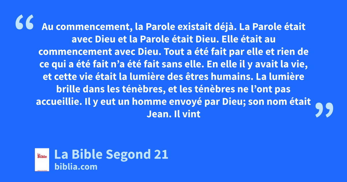 1 Au commencement, la Parolea existait déjà. La Parole était avec Dieu et la Parole était Dieu. 2Elle était au commencement avec Dieu. 3Tout a été fait par elle et rien de ce qui a été fait n’a été fait sans elle. 4En elle il y avait la vie, et cette vie était la lumière des êtres humains. 5La lumière brille dans les ténèbres, et les ténèbres ne l’ont pas accueillie.