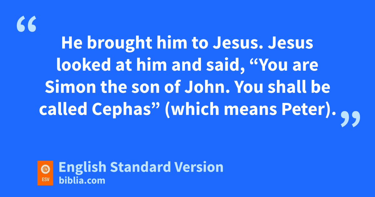 35 The next day again John was standing with two of his disciples, 36 and he looked at Jesus as he walked by and said, “Behold, ithe Lamb of God!” 37 The two disciples heard him say this, and they followed Jesus. 38 Jesus turned and saw them following and said to them, j“What are you seeking?” And they said to him, k“Rabbi” (which means Teacher), “where are you staying?” 39 He said to them, “Come and you will see.” So they came and saw where he was staying, and they stayed with him that day, for it was about the tenth hour.10 40 lOne of the two who heard John speak and followed Jesus11 was Andrew, Simon Peter’s brother. 41 He first found his own brother Simon and said to him, “We have found mthe Messiah” (which means Christ). 42 He brought him to Jesus. Jesus looked at him and said, “You are Simon the son of nJohn. You shall be called oCephas” (which means pPeter12).