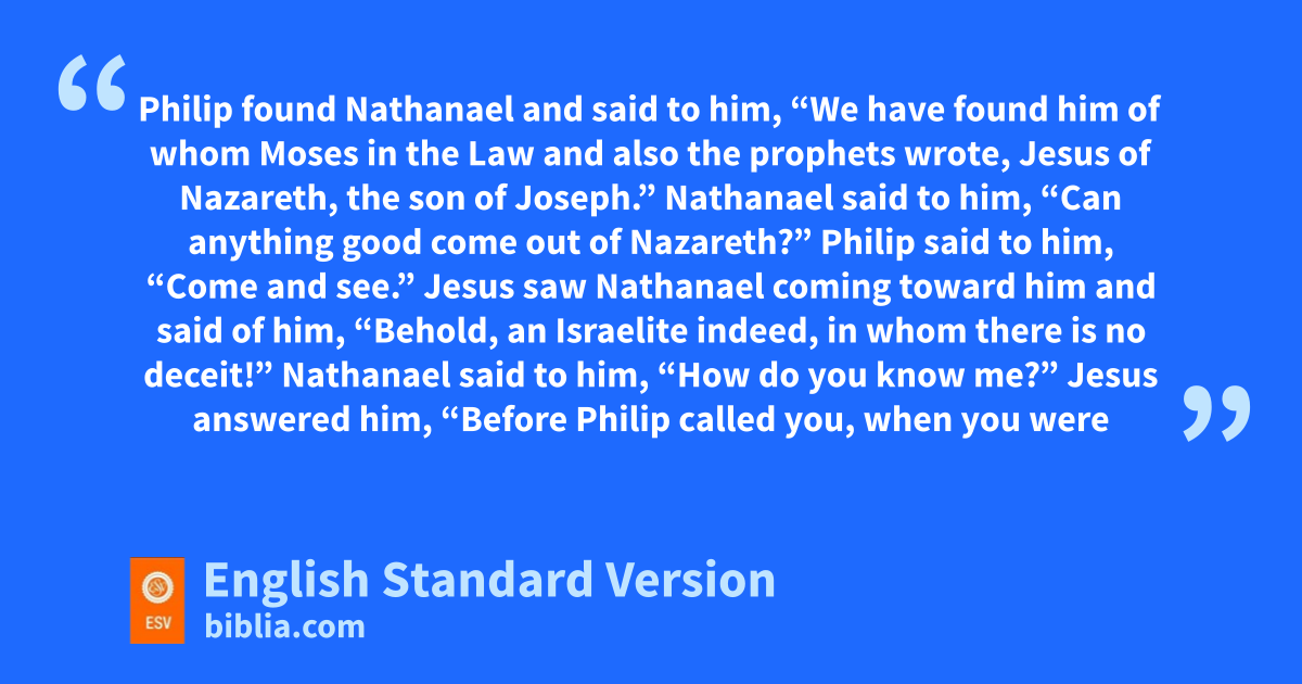 43 qThe next day Jesus decided rto go to Galilee. He found Philip and said to him, “Follow me.” 44 Now sPhilip was from Bethsaida, the city of Andrew and Peter. 45 Philip found tNathanael and said to him, “We have found him of whom uMoses in the Law and also the prophets wrote, Jesus vof Nazareth, wthe son of Joseph.” 46 Nathanael said to him, x“Can anything good come out of Nazareth?” Philip said to him, “Come and see.” 47 Jesus saw Nathanael coming toward him and said of him, “Behold, yan Israelite indeed, zin whom there is no deceit!” 48 Nathanael said to him, “How ado you know me?” Jesus answered him, “Before Philip called you, when you were under the fig tree, I saw you.” 49 Nathanael answered him, b“Rabbi, cyou are the Son of God! You are the dKing of Israel!” 50 Jesus answered him, “Because I said to you, ‘I saw you under the fig tree,’ do you believe? You will see greater things than these.” 51 And he said to him, “Truly, truly, I say to you,13 you will see eheaven opened, and fthe angels of God ascending and descending on gthe Son of Man.”