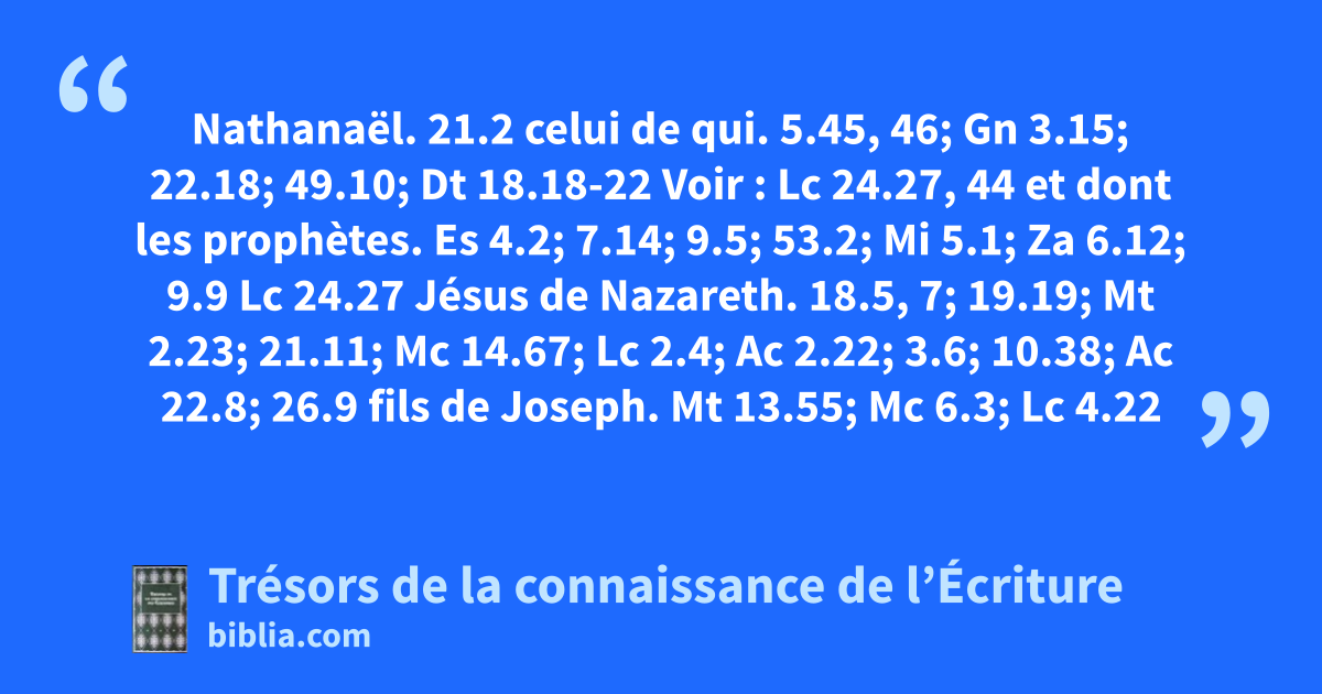 Nathanaël. 21.2 celui de qui. 5.45, 46; Gn 3.15; 22.18; 49.10; Dt 18.18-22 Voir : Lc 24.27, 44 et dont les prophètes. Es 4.2; 7.14; 9.5; 53.2; Mi 5.1; Za 6.12; 9.9 Lc 24.27 Jésus de Nazareth. 18.5, 7; 19.19; Mt 2.23; 21.11; Mc 14.67; Lc 2.4; Ac 2.22; 3.6; 10.38; Ac 22.8; 26.9 fils de Joseph. Mt 13.55; Mc 6.3; Lc 4.22