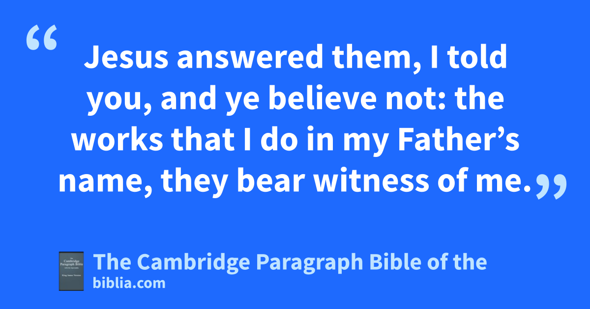 22 * And it was at Jerusalem the feast of nthe dedication, and it was owinter. 23 And Jesus walked in the temple pin Solomon’s porch. 24 Then came hthe Jews round about him, and said unto him, How long dost thou * make us to doubt? If thou be the Christ, tell us plainly. 25 Jesus answered them, qI told you, and ye believe not: rthe works that I do in my Father’s name, they bear witness of me. 26 But ye believe not, because ye are not of my sheep, stas I said unto you. 27 tMy sheep hear my voice, and I know them, and they follow me: 28 and I give unto them eternal life; and uthey shall never perish, wneither shall any man pluck them out of my hand. 29 xMy Father, ywhich gave them me, is greater than all; and no man is able to pluck them out of my Father’s hand. 30 zI and my Father are one. 31 Then hthe Jews atook up stones again to stone him. 32 Jesus answered them, Many bgood works have I shewed you from my Father; for which of those works do ye stone me? 33 hThe Jews answered him, saying, For a good work we stone thee not; but for cblasphemy; and because that thou, being a man, dmakest thyself God. 34 Jesus answered them, Is it not written in eyour law, fI said, Ye are ggods? 35 If he called them gods, unto whom the word of God came, and the scripture cannot be broken; 36 say ye of him, whom the Father hhath sanctified, and isent into the world, kThou blasphemest; lbecause I said, I am mthe Son of God? 37 nIf I do not the works of my Father, believe me not. 38 But if I do, othough ye believe not me, believe the works: that ye may know, and believe, that pthe Father is in me, and I in him. 39 Therefore qthey sought again to take him: rbut he escaped out of their hand, 40 and went away again sbeyond Jordan into the place twhere John at first baptized; and there he abode. 41 And many resorted unto him, and said, uJohn did no miracle: but xall things that John spake of this man were true. 42 And ymany believed on him there.