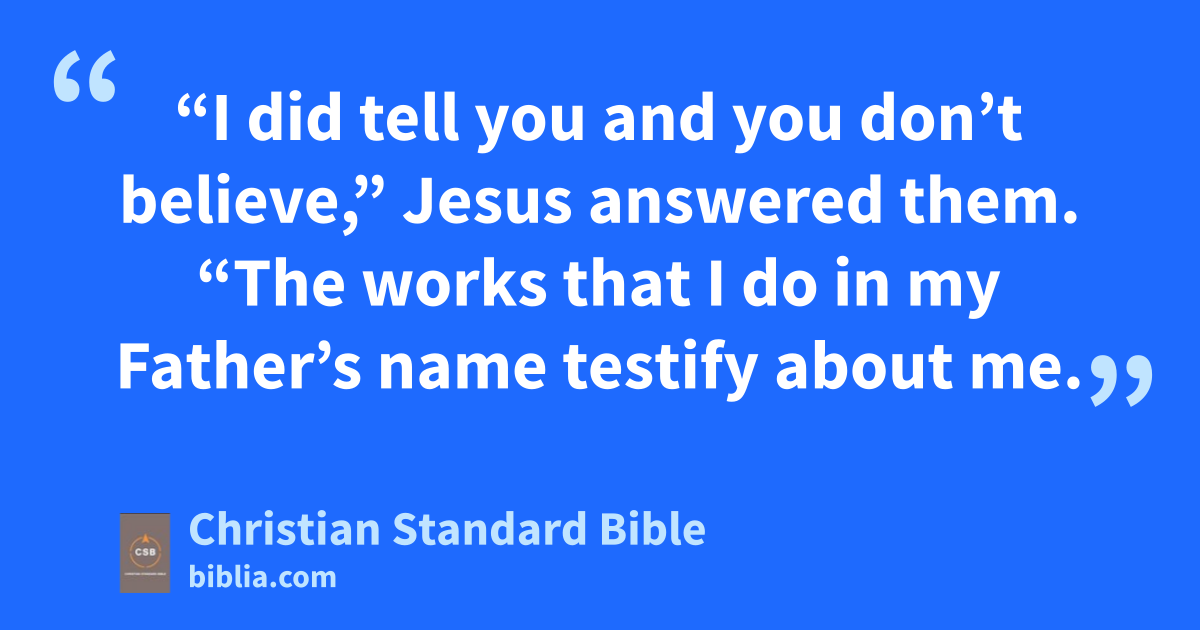 25 “I did tell you and you don’t believe,” Jesus answered them. “The workss that I do in my Father’s name testify about me. 26 But you don’t believe because you are not of my sheep.C,t 27 My sheep hear my voice, I know them, and they follow me. 28 I give them eternal life,u and they will never perish.v No one will snatchw them out of my hand. 29 My Father,x who has given them to me, is greater than all. No one is able to snatch them out of the Father’s hand. 30 I and the Father are one.”y