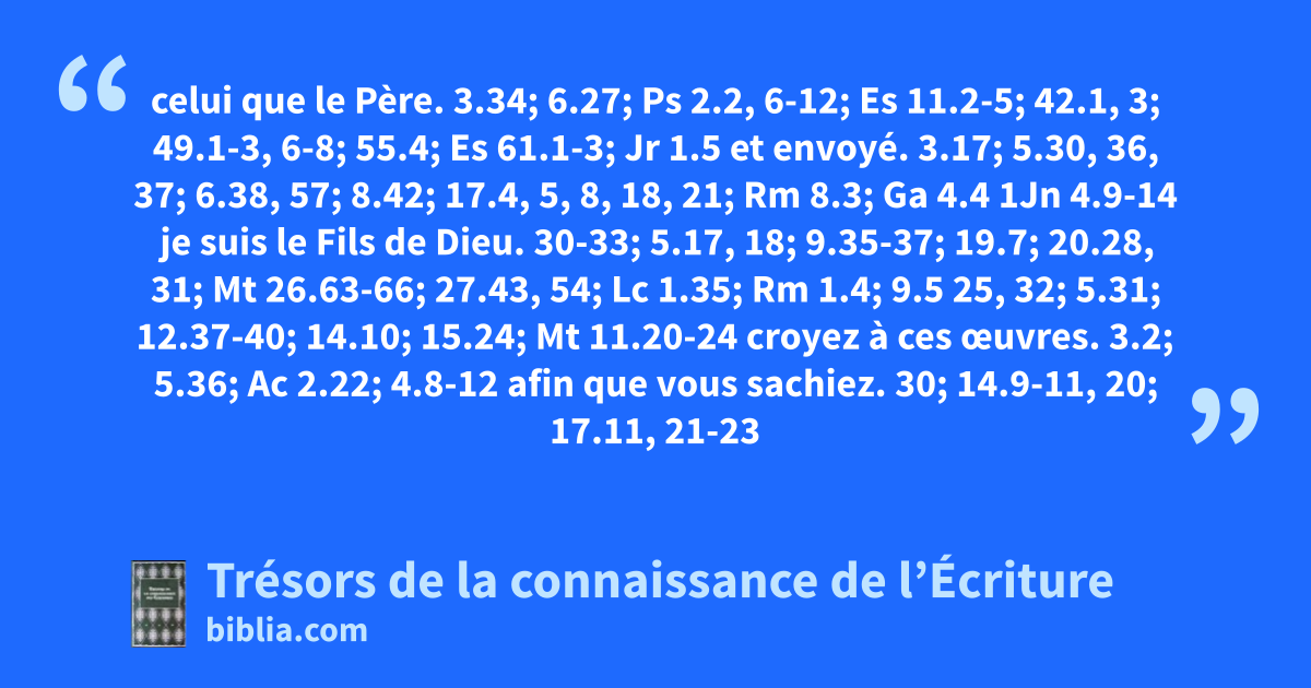 celui que le Père. 3.34; 6.27; Ps 2.2, 6-12; Es 11.2-5; 42.1, 3; 49.1-3, 6-8; 55.4; Es 61.1-3; Jr 1.5 et envoyé. 3.17; 5.30, 36, 37; 6.38, 57; 8.42; 17.4, 5, 8, 18, 21; Rm 8.3; Ga 4.4 1Jn 4.9-14 je suis le Fils de Dieu. 30-33; 5.17, 18; 9.35-37; 19.7; 20.28, 31; Mt 26.63-66; 27.43, 54; Lc 1.35; Rm 1.4; 9.5