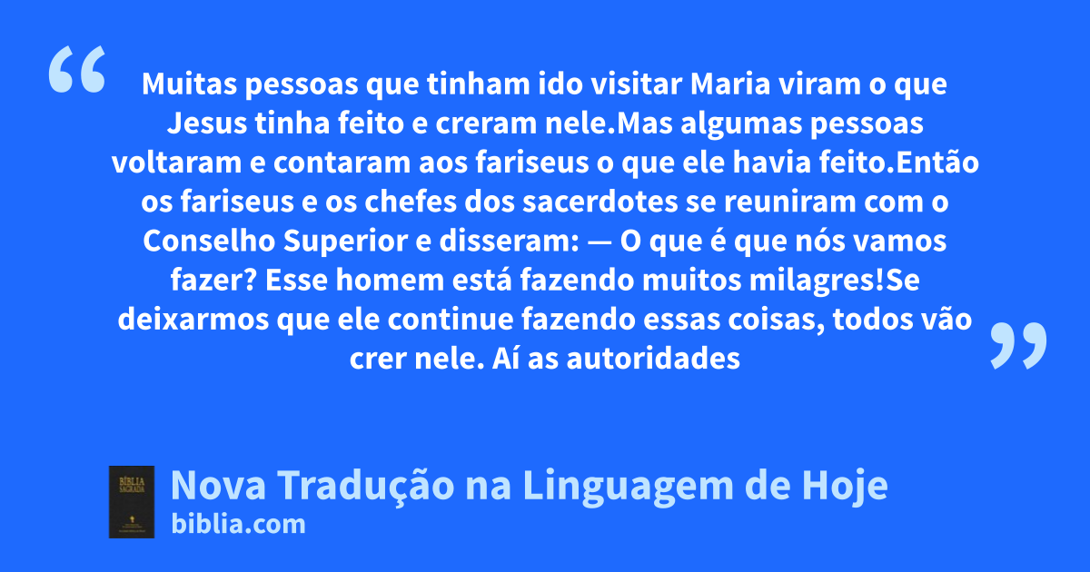 45 Muitas pessoas que tinham ido visitar Maria viram o que Jesus tinha feito e creram nele.46 Mas algumas pessoas voltaram e contaram aos * fariseus o que ele havia feito.47 Então os fariseus e os chefes dos sacerdotes se reuniram com o * Conselho Superior e disseram: