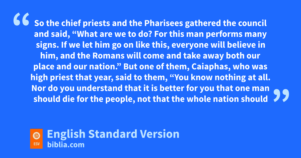 45 nMany of the Jews therefore, owho had come with Mary and phad seen what he did, believed in him, 46 but some of them went to the Pharisees and told them what Jesus had done. 47 So the chief priests and the Pharisees qgathered rthe council and said, s“What are we to do? For this man performs many signs. 48 If we let him go on like this, everyone will believe in him, and tthe Romans will come and take away both our uplace and our nation.” 49 But one of them, vCaiaphas, wwho was high priest that year, said to them, “You know nothing at all. 50 Nor do you understand that xit is better for you that one man should die for the people, not that the whole nation should perish.” 51 He did not say this of his own accord, but ybeing high priest that year zhe prophesied that Jesus would die for the nation, 52 and anot for the nation only, but also bto gather into one the children of God who are scattered abroad. 53 So from that day on they cmade plans to put him to death.