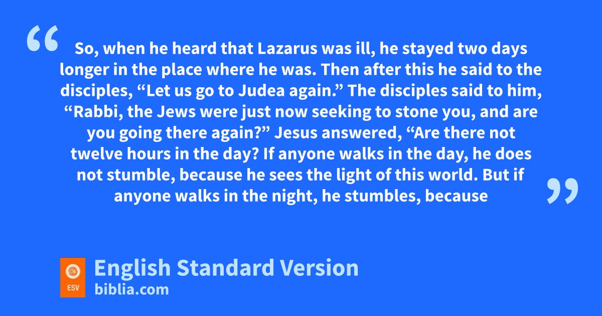 5 Now qJesus loved Martha and her sister and Lazarus. 6 So, when he heard that Lazarus1 was ill, rhe stayed two days longer in the place where he was. 7 Then after this he said to the disciples, s“Let us go to Judea again.” 8 The disciples said to him, t“Rabbi, uthe Jews were just now seeking to stone you, and are you going there again?” 9 Jesus answered, v“Are there not twelve hours in the day? wIf anyone walks in the day, he does not stumble, because he sees the light of this world. 10 But xif anyone walks in the night, he stumbles, because the light is not xin him.” 11 After saying these things, he said to them, “Our friend Lazarus yhas fallen asleep, but I go to awaken him.” 12 The disciples said to him, “Lord, if he has fallen asleep, he will recover.” 13 Now Jesus had spoken of his death, but they thought that he meant taking rest in sleep. 14 Then Jesus told them plainly, “Lazarus has died, 15 and for your sake I am glad that I was not there, so that you may believe. But let us go to him.” 16 zSo Thomas, called the Twin,2 said to his fellow disciples, “Let us also go, athat we may die with him.”