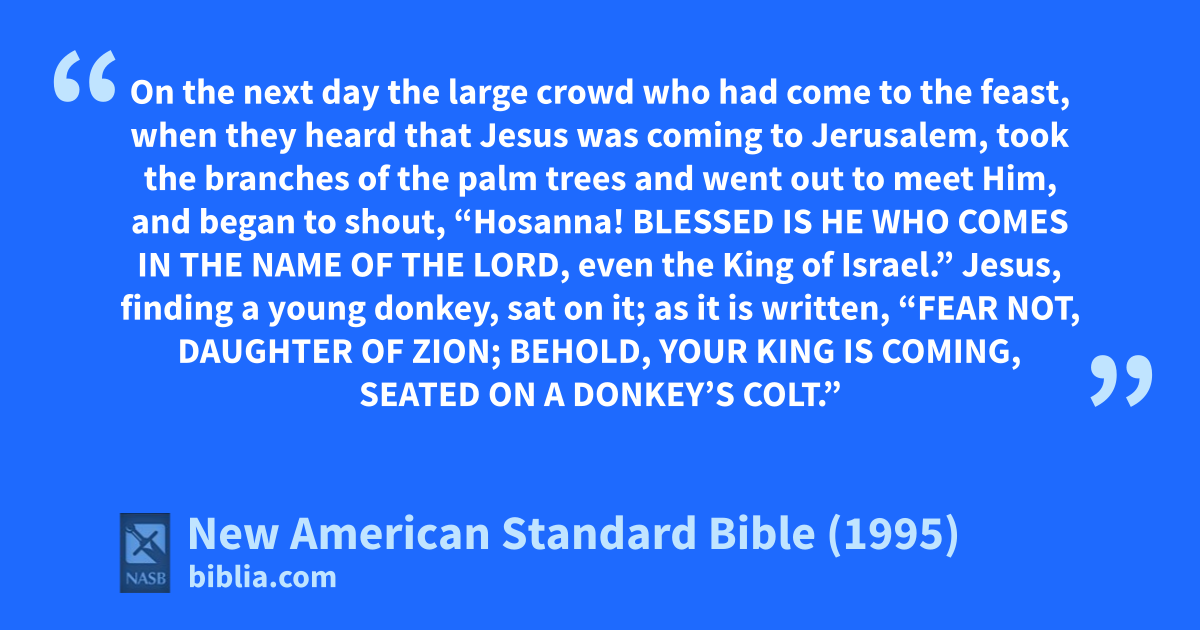 13 took the branches of the palm trees and went out to meet Him, and began to shout, “aHosanna! Blessed is He who comes in the name of the Lord, even the bKing of Israel.”