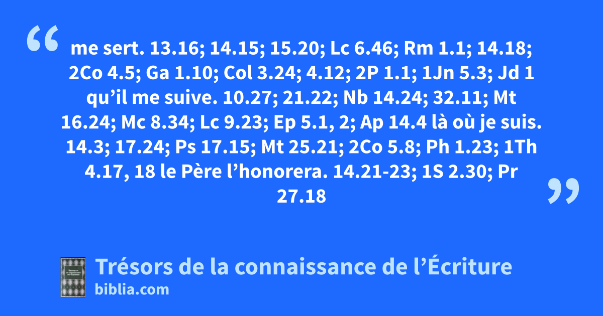 me sert. 13.16; 14.15; 15.20; Lc 6.46; Rm 1.1; 14.18; 2Co 4.5; Ga 1.10; Col 3.24; 4.12; 2P 1.1; 1Jn 5.3; Jd 1 qu’il me suive. 10.27; 21.22; Nb 14.24; 32.11; Mt 16.24; Mc 8.34; Lc 9.23; Ep 5.1, 2; Ap 14.4 là où je suis. 14.3; 17.24; Ps 17.15; Mt 25.21; 2Co 5.8; Ph 1.23; 1Th 4.17, 18 le Père l’honorera. 14.21-23; 1S 2.30; Pr 27.18