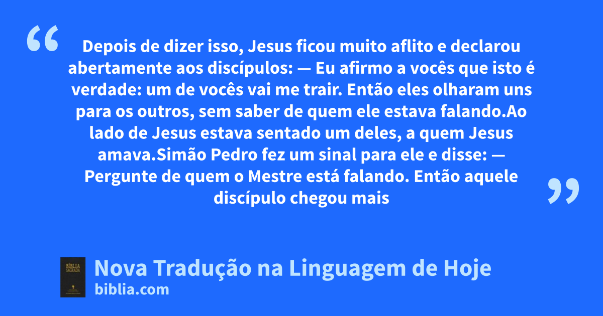22 Então eles olharam uns para os outros, sem saber de quem ele estava falando.23 Ao lado de Jesus estava sentado um deles, a quem Jesus amava.24 Simão Pedro fez um sinal para ele e disse: