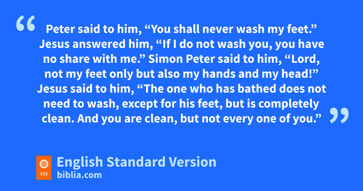 13 Now nbefore othe Feast of the Passover, when Jesus knew that phis hour had come qto depart out of this world to the Father, rhaving loved shis own who were in the world, he loved them to the end. 2 During supper, when tthe devil had already put it into the heart of Judas Iscariot, Simon’s son, to betray him, 3 Jesus, knowing uthat the Father had given all things into his hands, and that vhe had come from God and wwas going back to God, 4 rose from supper. He laid aside his outer garments, and taking a towel, xtied it around his waist. 5 Then he ypoured water into a basin and began to wash the disciples’ feet and to wipe them with the towel that was wrapped around him. 6 He came to Simon Peter, who said to him, “Lord, do you wash my feet?” 7 zJesus answered him, “What I am doing ayou do not understand now, but afterward you will understand.” 8 bPeter said to him, “You shall never wash my feet.” Jesus answered him, c“If I do not wash you, you have no share with me.” 9 Simon Peter said to him, “Lord, not my feet only but also my hands and my head!” 10 Jesus said to him, “The one who has bathed does not need to wash, dexcept for his feet,1 but is completely clean. And eyou2 are clean, fbut not every one of you.” 11 gFor he knew who was to betray him; that was why he said, “Not all of you are clean.”