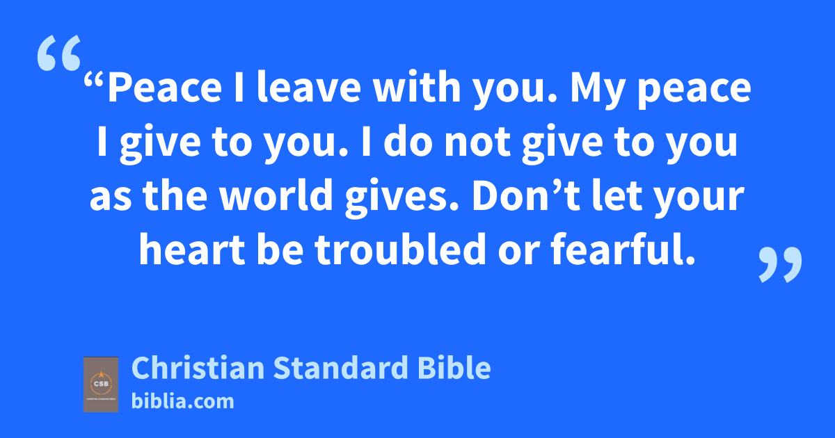27 “Peace I leave with you. My peace I give to you. I do not give to you as the world gives. Don’t let your heart be troubled or fearful.al 28 You have heard me tell you, ‘I am going awayam and I am coming to you.’ If you loved me, you would rejoice that I am going to the Father,an because the Father is greater than I.ao 29 I have told you now before it happensap so that when it does happen you may believe. 30 I will not talk with you much longer, because the ruler of the worldaq is coming. He has no power over me.A,ar 31 On the contrary, so that the world may know that I love the Father, I do as the Father commanded me.