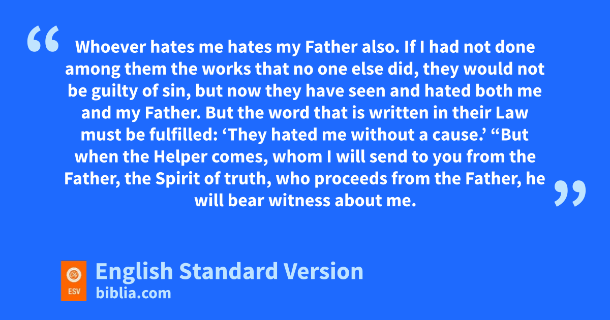 18 d“If the world hates you, know that it has hated me before it hated you. 19 eIf you were of the world, the world would love you as its own; but because fyou are not of the world, but I chose you out of the world, therefore the world hates you. 20 Remember the word that I said to you: g‘A servant is not greater than his master.’ If they persecuted me, hthey will also persecute you. iIf they kept my word, they will also keep yours. 21 But jall these things they will do to you kon account of my name, lbecause they do not know him who sent me. 22 If I had not come and spoken to them, mthey would not have been guilty of sin,3 but now they have no excuse for their sin. 23 nWhoever hates me hates my Father also. 24 oIf I had not done among them the works that no one else did, mthey would not be guilty of sin, but now they have pseen and hated both me and my Father. 25 But qthe word that is written in their Law must be fulfilled: r‘They hated me without a cause.’