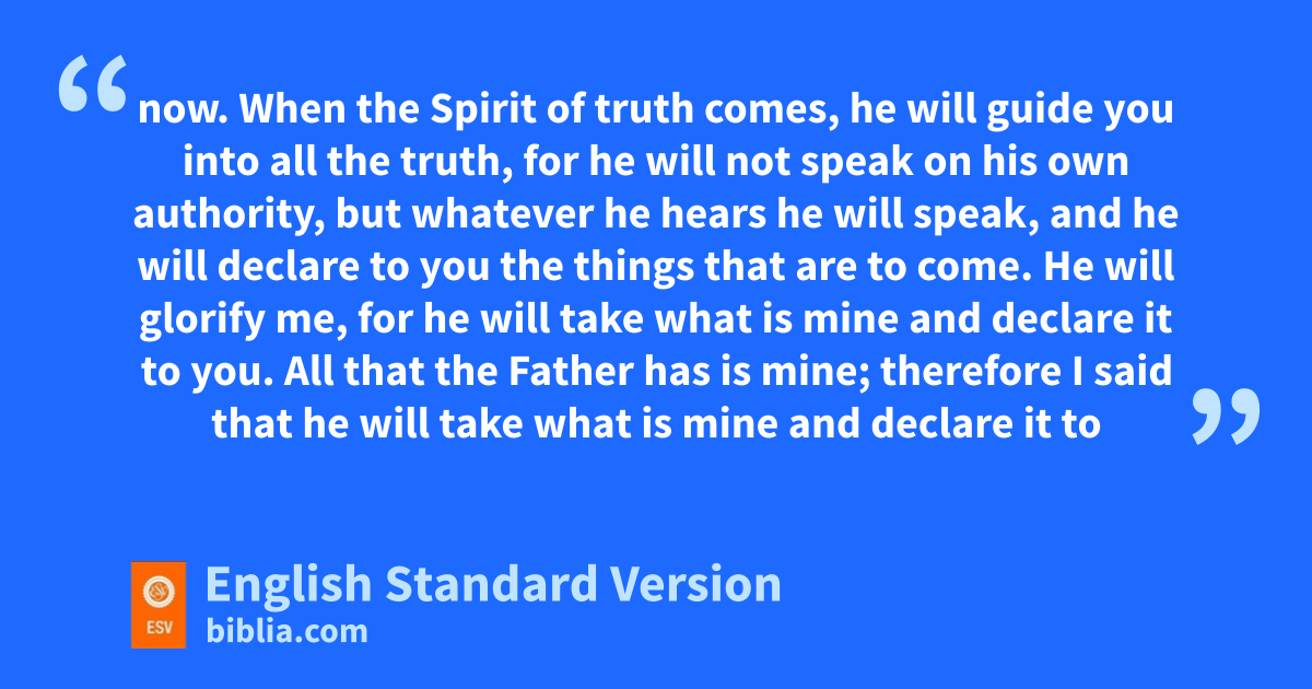 12 “I still have many things to say to you, but you cannot bear them now. 13 When tthe Spirit of truth comes, uhe will vguide you into all the truth, for he will not speak on his own authority, but wwhatever he hears he will speak, and he will declare to you the things that are to come. 14 He will xglorify me, for he will take what is mine and declare it to you. 15 yAll that the Father has is mine; ztherefore I said that he will take what is mine and declare it to you.