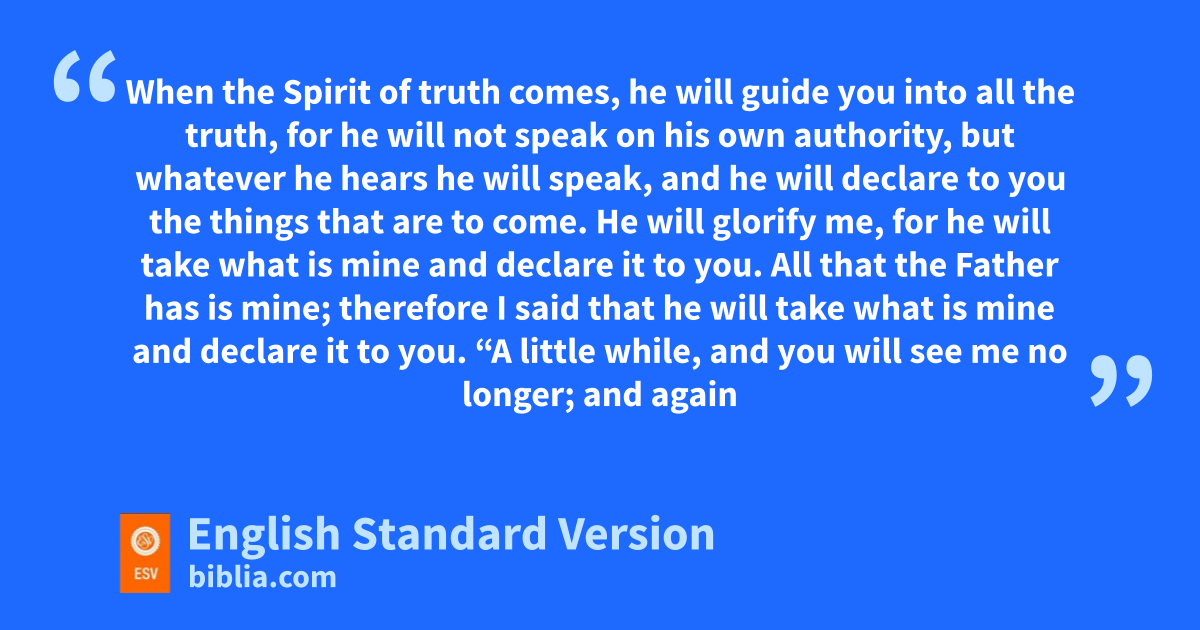 12 “I still have many things to say to you, but you cannot bear them now. 13 When tthe Spirit of truth comes, uhe will vguide you into all the truth, for he will not speak on his own authority, but wwhatever he hears he will speak, and he will declare to you the things that are to come. 14 He will xglorify me, for he will take what is mine and declare it to you. 15 yAll that the Father has is mine; ztherefore I said that he will take what is mine and declare it to you.