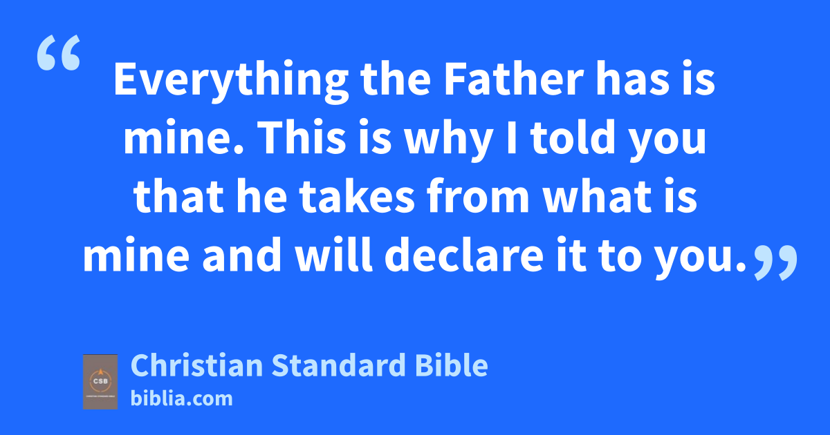 12 “I still have many things to tell you, but you can’t bear them now.ap 13 When the Spirit of truthaq comes, he will guide you into all the truth.ar For he will not speak on his own, but he will speak whatever he hears. He will also declare to you what is to come. 14 He will glorify me, because he will take from what is mine and declare it to you. 15 Everything the Fatheras has is mine.at This is why I told you that he takes from what is mine and will declare it to you.au
