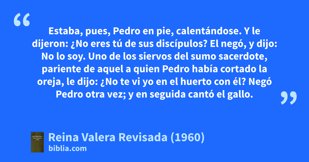 25Estaba, pues, Pedro en pie, calentándose. Y le dijeron: ¿No eres tú de sus discípulos? El negó, y dijo: No lo soy. 26Uno de los siervos del sumo sacerdote, pariente de aquel a quien Pedro había cortado la oreja, le dijo: ¿No te vi yo en el huerto con él? 27Negó Pedro otra vez; y en seguida cantó el gallo.