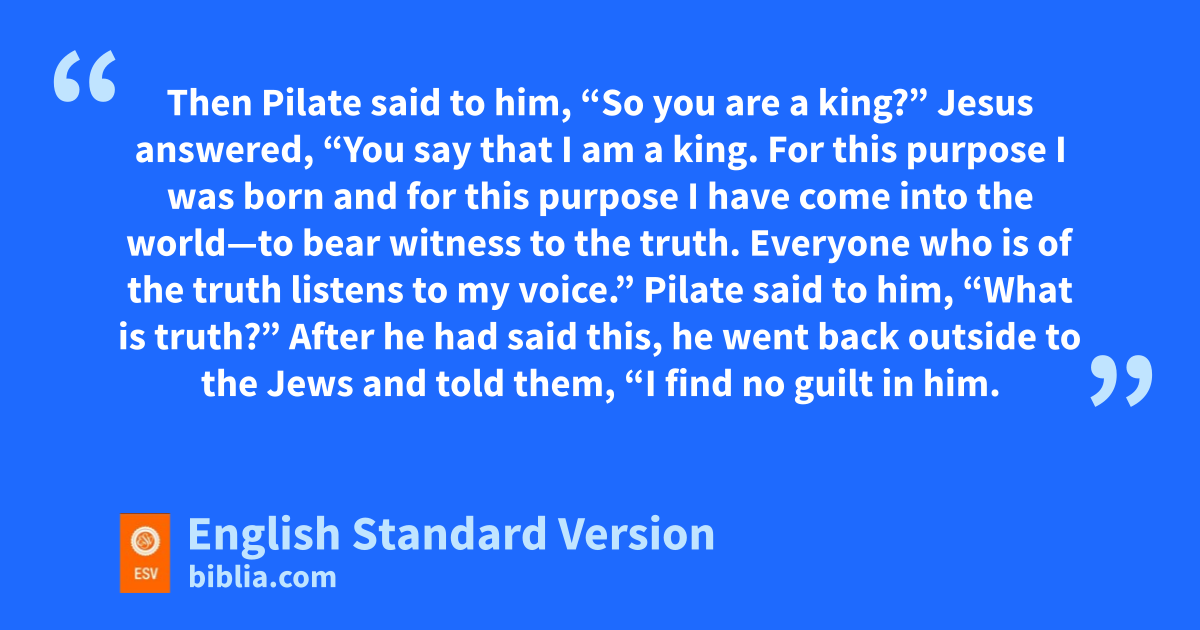 33 zSo Pilate entered his headquarters again and called Jesus and said to him, a“Are you the King of the Jews?” 34 Jesus answered, “Do you say this of your own accord, or did others say it to you about me?” 35 Pilate answered, “Am I a Jew? Your own nation and the chief priests have delivered you over to me. What have you done?” 36 Jesus answered, b“My kingdom cis not of this world. If my kingdom were of this world, dmy servants would have been fighting, that eI might not be delivered over to the Jews. But my kingdom is not from the world.” 37 Then Pilate said to him, “So you are a king?” Jesus answered, f“You say that I am a king. gFor this purpose I was born and for this purpose hI have come into the world—ito bear witness to the truth. jEveryone who is kof the truth llistens to my voice.” 38 Pilate said to him, “What is truth?”