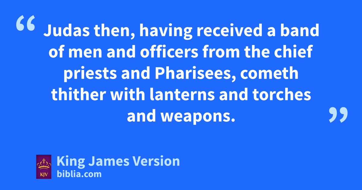 18 When Jesus had spoken these words, ahe went forth with his disciples over bthe brook Cedron, awhere was a garden, into the which he entered, and his disciples. 2 And Judas also, which betrayed him, knew cthe place: dfor Jesus ofttimes resorted thither with his disciples. 3 eJudas then, having received a fband of men and gofficers from the chief priests and Pharisees, cometh thither with lanterns and htorches and weapons. 4 Jesus therefore, knowing all things that should come upon him, went forth, and said unto them, iWhom seek ye? 5 They answered him, Jesus of Nazareth. Jesus saith unto them, I am he. And Judas also, which betrayed him, stood with them. 6 As soon then as he had said unto them, I am he, they went backward, and fell to the ground. 7 Then asked he them again, Whom seek ye? And they said, Jesus of Nazareth. 8 Jesus answered, I have told you that I am he: if therefore ye seek me, let these go their way: 9 That the saying might be fulfilled, which he spake, kOf them which thou gavest me have I lost none. 10 Then Simon Peter having a sword drew it, and smote the high priest’s servant, and cut off his right ear. The servant’s name was Malchus. 11 Then said Jesus unto Peter, Put up thy sword into the sheath: lthe cup which my Father hath given me, shall I not drink it?