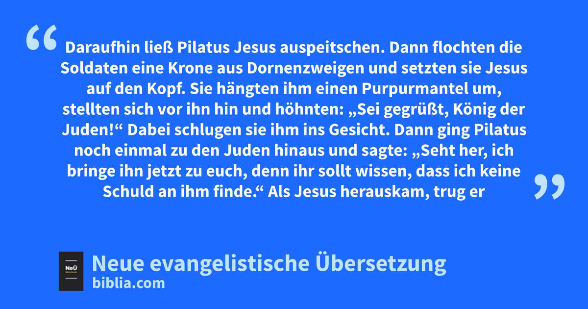 19 1 Daraufhin ließ Pilatus Jesus auspeitschen. 2 Dann flochten die Soldaten eine Krone aus Dornenzweigen und setzten sie Jesus auf den Kopf. Sie hängten ihm einen Purpurmantel um, 3 stellten sich vor ihn hin und höhnten: „Sei gegrüßt, König der Juden!“ Dabei schlugen sie ihm ins Gesicht.