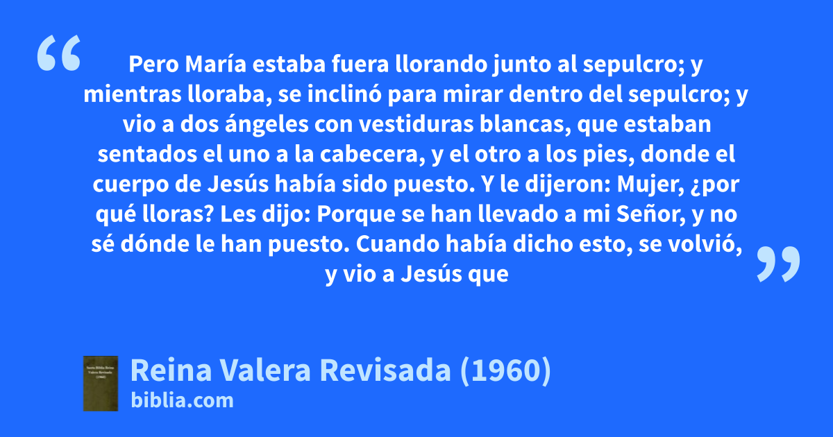 11Pero María estaba fuera llorando junto al sepulcro; y mientras lloraba, se inclinó para mirar dentro del sepulcro; 12y vio a dos ángeles con vestiduras blancas, que estaban sentados el uno a la cabecera, y el otro a los pies, donde el cuerpo de Jesús había sido puesto. 13Y le dijeron: Mujer, ¿por qué lloras? Les dijo: Porque se han llevado a mi Señor, y no sé dónde le han puesto. 14Cuando había dicho esto, se volvió, y vio a Jesús que estaba allí; mas no sabía que era Jesús. 15Jesús le dijo: Mujer, ¿por qué lloras? ¿A quién buscas? Ella, pensando que era el hortelano, le dijo: Señor, si tú lo has llevado, dime dónde lo has puesto, y yo lo llevaré. 16Jesús le dijo: ¡María! Volviéndose ella, le dijo: ¡Raboni! (que quiere decir, Maestro). 17Jesús le dijo: No me toques, porque aún no he subido a mi Padre; mas ve a mis hermanos, y diles: Subo a mi Padre y a vuestro Padre, a mi Dios y a vuestro Dios. 18Fue entonces María Magdalena para dar a los discípulos las nuevas de que había visto al Señor, y que él le había dicho estas cosas.