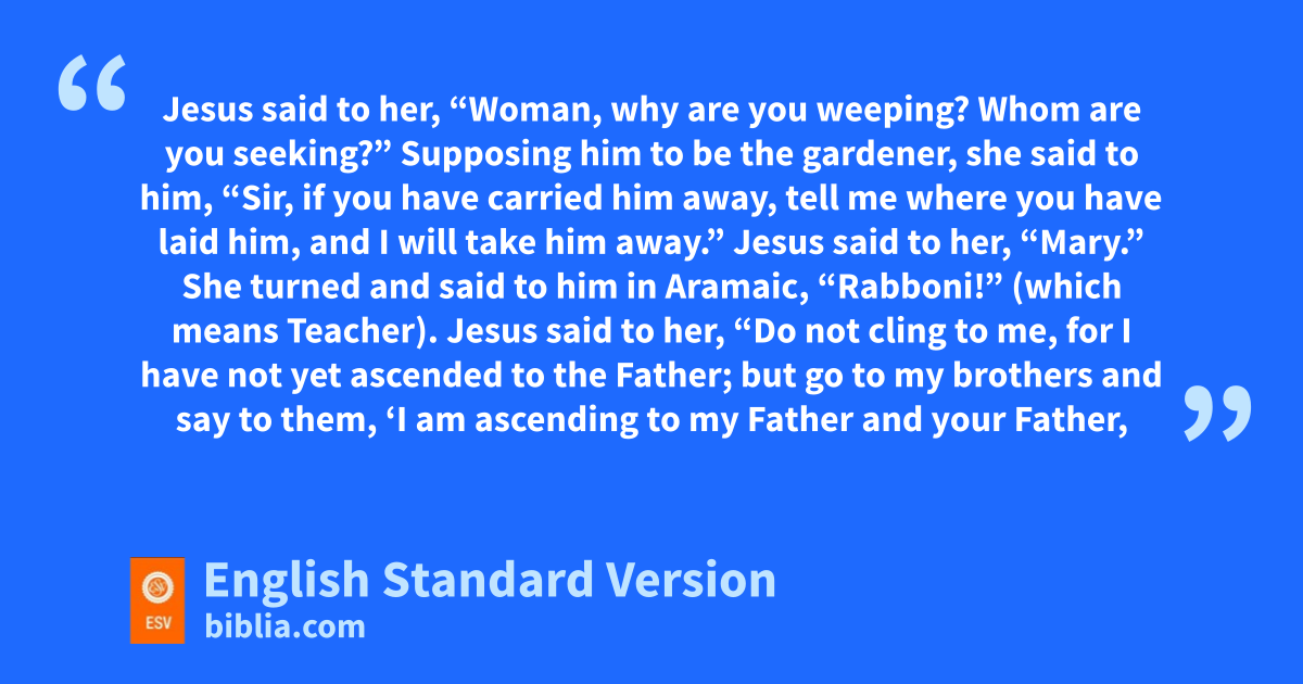 11 But Mary stood weeping outside the tomb, and as she wept she stooped to look into the tomb. 12 And oshe saw ptwo angels in white, sitting where the body of Jesus had lain, one at the head and one at the feet. 13 They said to her, q“Woman, why are you weeping?” She said to them, r“They have taken away my Lord, and I do not know where they have laid him.” 14 Having said this, she turned around and ssaw Jesus standing, tbut she did not know that it was Jesus. 15 Jesus said to her, u“Woman, why are you weeping? vWhom are you seeking?” Supposing him to be wthe gardener, she said to him, “Sir, if you have carried him away, tell me where you have laid him, and I will take him away.” 16 Jesus said to her, “Mary.” She turned and said to him in Aramaic,2 x“Rabboni!” (which means Teacher). 17 Jesus said to her, “Do not cling to me, for I have not yet ascended to the Father; but go to ymy brothers and say to them, z‘I am ascending to my Father and your Father, to amy God and your God.’ ” 18 Mary Magdalene bwent and announced to the disciples, “I have seen the Lord”—and that he had said these things to her.