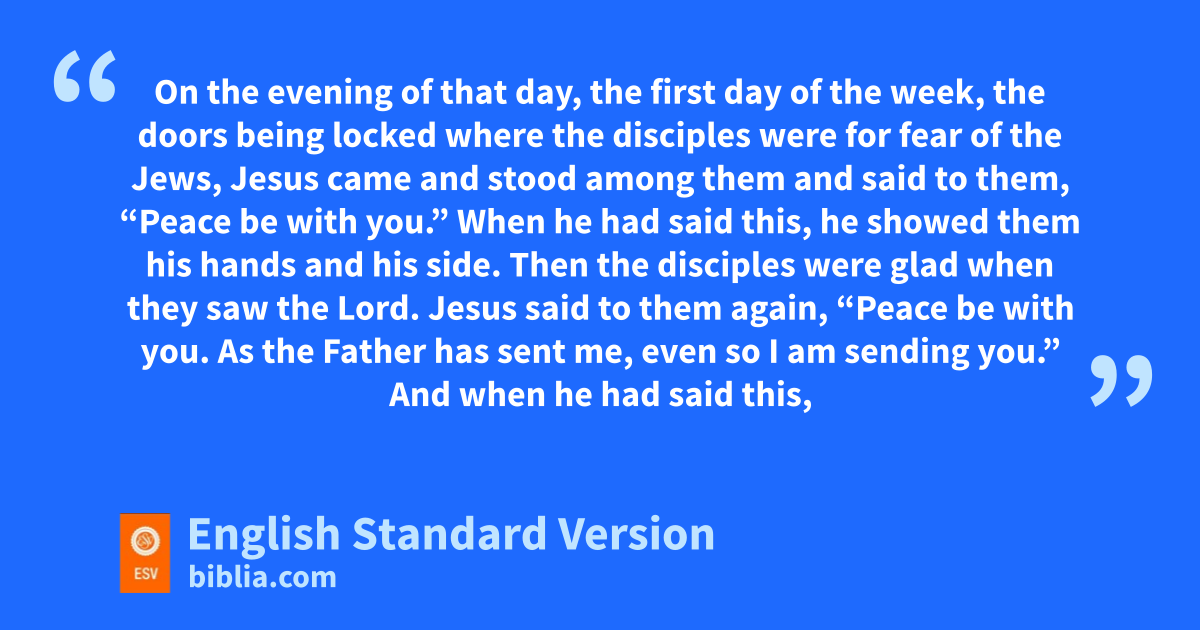 19 cOn the evening dof that day, the first day of the week, ethe doors being locked where the disciples were ffor fear of the Jews,3 Jesus came and stood among them and said to them, g“Peace be with you.” 20 When he had said this, hhe showed them his hands and his side. Then ithe disciples were glad when they saw the Lord. 21 Jesus said to them again, “Peace be with you. As jthe Father has sent me, keven so I am sending you.” 22 And when he had said this, he lbreathed on them and said to them, m“Receive the Holy Spirit. 23 nIf you forgive the sins of any, they are forgiven them; if you withhold forgiveness from any, it is withheld.”