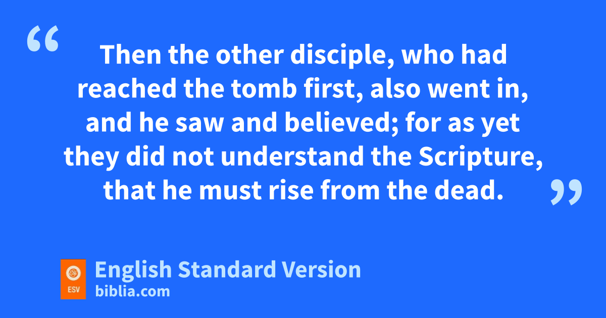 20 eNow on the first day of the week Mary Magdalene came to the tomb early, while it was still dark, and saw that fthe stone had been taken away from the tomb. 2 So she ran and went to Simon Peter and the other disciple, gthe one whom Jesus loved, and said to them, “They have taken the Lord out of the tomb, and hwe do not know where they have laid him.” 3 iSo Peter went out with the other disciple, and they were going toward the tomb. 4 Both of them were running together, but the other disciple outran Peter and reached the tomb first. 5 And stooping to look in, he saw jthe linen cloths lying there, but he did not go in. 6 Then Simon Peter came, following him, and went into the tomb. He saw the linen cloths lying there, 7 and kthe face cloth, which had been on Jesus’1 head, not lying with the linen cloths but folded up in a place by itself. 8 Then the other disciple, lwho had reached the tomb first, also went in, and he saw and believed; 9 for as yet mthey did not understand the Scripture, nthat he must rise from the dead. 10 Then the disciples went back to their homes.