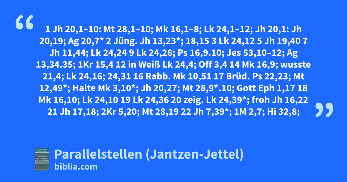 1 Jh 20,1–10: Mt 28,1–10; Mk 16,1–8; Lk 24,1–12; Jh 20,1: Jh 20,19; Ag 20,7*