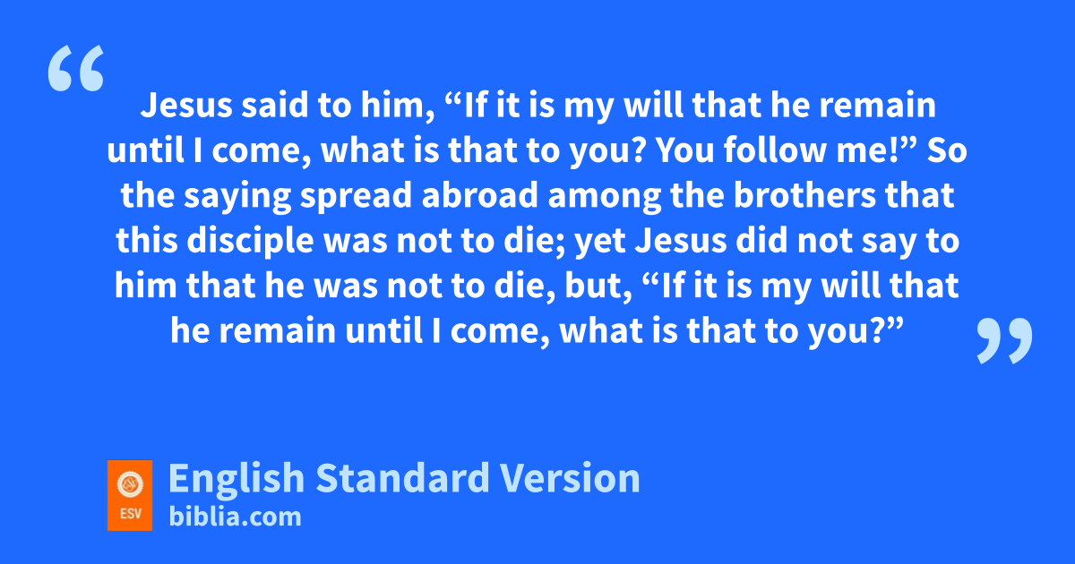 20 Peter turned and saw hthe disciple whom Jesus loved following them, ithe one who also had leaned back against him during the supper and had said, “Lord, who is it that is going to betray you?” 21 When Peter saw him, he said to Jesus, “Lord, what about this man?” 22 Jesus said to him, “If it is my will that he remain juntil kI come, what is that to you? lYou follow me!” 23 So the saying spread abroad among mthe brothers2 that this disciple was not to die; yet Jesus did not say to him that he was not to die, but, “If it is my will that he remain until I come, what is that to you?”