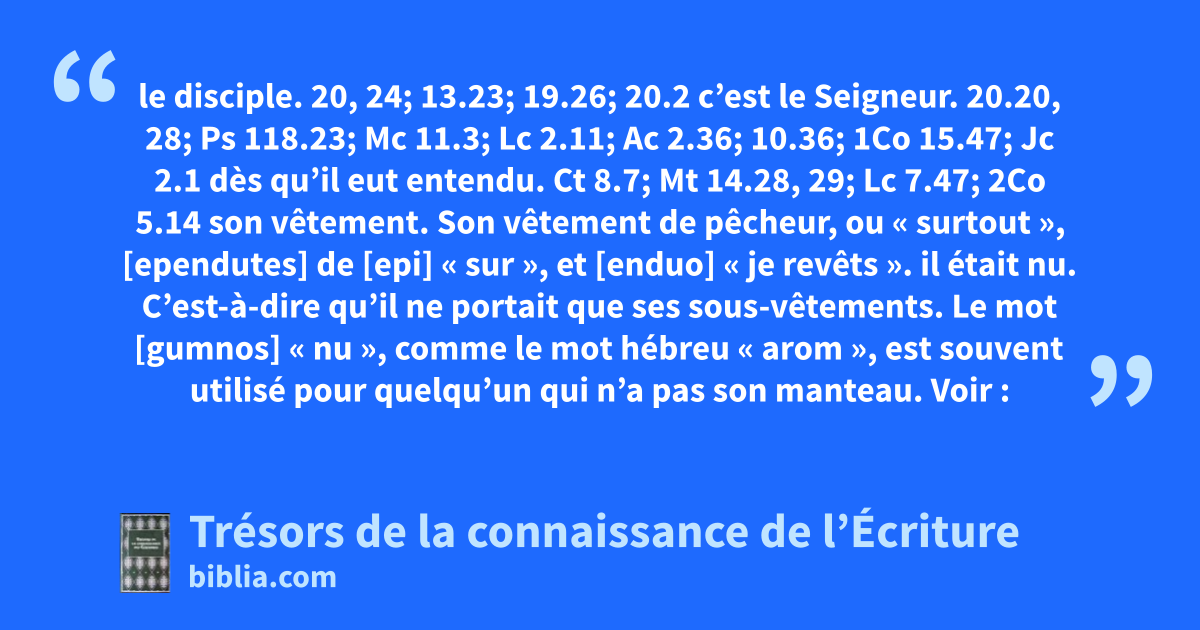 le disciple. 20, 24; 13.23; 19.26; 20.2 c’est le Seigneur. 20.20, 28; Ps 118.23; Mc 11.3; Lc 2.11; Ac 2.36; 10.36; 1Co 15.47; Jc 2.1 dès qu’il eut entendu. Ct 8.7; Mt 14.28, 29; Lc 7.47; 2Co 5.14 son vêtement. Son vêtement de pêcheur, ou « surtout », [ependutes] de [epi] « sur », et [enduo] « je revêts ». il était nu. C’est-à-dire qu’il ne portait que ses sous-vêtements. Le mot [gumnos] « nu », comme le mot hébreu « arom », est souvent utilisé pour quelqu’un qui n’a pas son manteau. Voir : 1S 19.24; 2S 6.20 Voir SCOFIELD Notes.