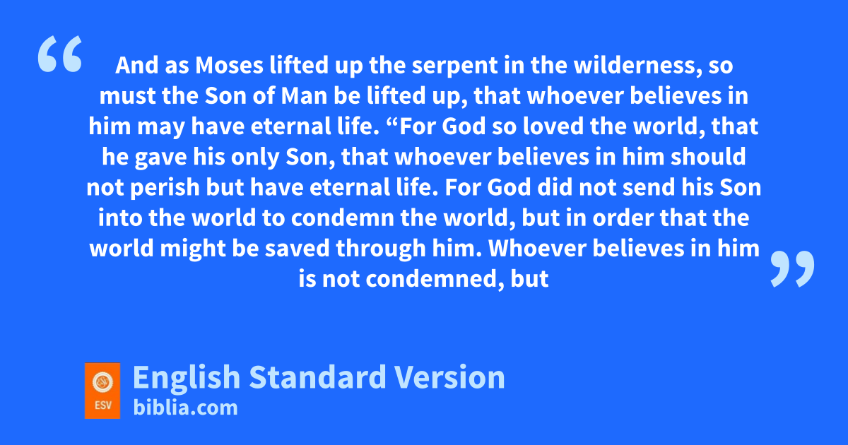 16 “For hGod so loved ithe world,9 jthat he gave his only Son, that whoever believes in him should not kperish but have eternal life. 17 For lGod did not send his Son into the world mto condemn the world, but in order that the world might be saved through him. 18 nWhoever believes in him is not condemned, but whoever does not believe is condemned already, because he has not obelieved in the name of the only Son of God. 19 pAnd this is the judgment: qthe light has come into the world, and rpeople loved the darkness rather than the light because stheir works were evil. 20 tFor everyone who does wicked things hates the light and does not come to the light, ulest his works should be exposed. 21 But whoever vdoes what is true wcomes to the light, so that it may be clearly seen that his works have been carried out in God.”