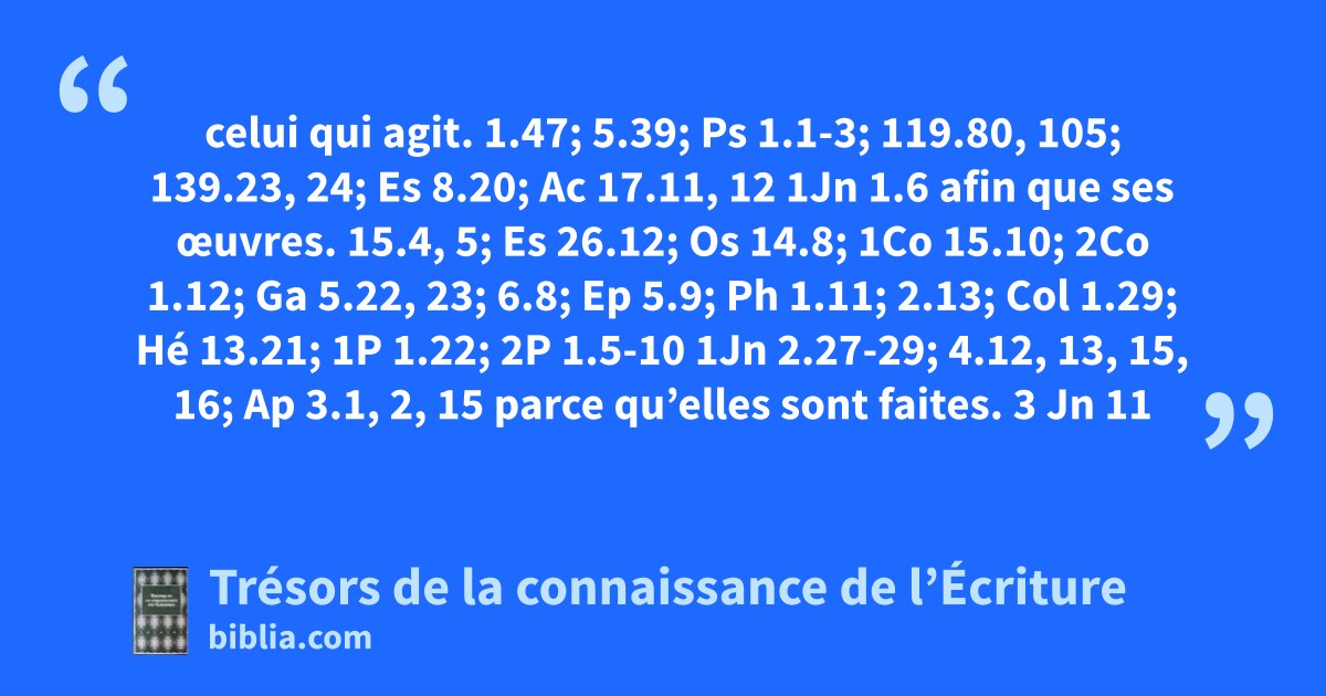 celui qui agit. 1.47; 5.39; Ps 1.1-3; 119.80, 105; 139.23, 24; Es 8.20; Ac 17.11, 12 1Jn 1.6 afin que ses œuvres. 15.4, 5; Es 26.12; Os 14.8; 1Co 15.10; 2Co 1.12; Ga 5.22, 23; 6.8; Ep 5.9; Ph 1.11; 2.13; Col 1.29; Hé 13.21; 1P 1.22; 2P 1.5-10 1Jn 2.27-29; 4.12, 13, 15, 16; Ap 3.1, 2, 15 parce qu’elles sont faites. 3 Jn 11