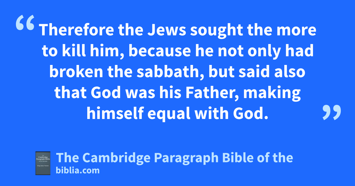 16 And therefore did fthe Jews persecute Jesus, and nsought to slay him, because jhe had done these things on the sabbath day. 17 But Jesus kanswered them, My Father worketh lhitherto, mand I work. 18 Therefore fthe Jews nsought the more to kill him, because he not only jhad broken the sabbath, but osaid also that God was phis Father, qmaking himself equal with God. 19 Then kanswered Jesus and said unto them, Verily, verily, I say unto you, The Son can do nothing rof himself, but what he seeth the Father do: for what things soever he doeth, these also doeth the Son likewise. 20 For sthe Father loveth the Son, and sheweth him all things that himself doeth: and the will shew him greater works than these, that ye may marvel. 21 For as the Father raiseth up the dead, and uquickeneth them; even so vthe Son quickeneth whom he will. 22 For the Father judgeth no man, but whath committed all xjudgment unto the Son: 23 that all men should honour the Son, even as they yhonour the Father. zHe that honoureth not the Son honoureth not the Father which hath sent him. 24 Verily, verily, I say unto you, aHe that heareth my word, and believeth on him that sent me, hath everlasting life, and shall not come into condemnation; but bis passed from death unto life. 25 Verily, verily, I say unto you, cThe hour is coming, and now is, when dthe dead shall hear ddthe voice of the Son of God: and they that hear shall live. 26 For as the Father hath life in himself; eso hath he given to the Son to have life in himself; 27 and fhath given him gauthority to execute hjudgment also, ibecause he is the Son of man. 28 jMarvel not at this: for dthe hour is coming, in the which all that are in the graves shall hear his voice, 29 kand shall come forth; lthey that have mdone good, unto the resurrection of life; and they that have mndone evil, unto the resurrection of damnation. 30 oI can of mine own self do nothing: as I hear, I judge: and my judgment is just; because pI seek not mine own will, but qthe will of the Father which hath sent me. 31 rIf I bear witness of myself, my witness is not true. 32 There is sanother that beareth witness of me; and tI know that the witness which he witnesseth of me is true. 33 uYe sent unto John, and vhe bare witness unto the truth. 34 But wI receive not testimony from man: but these things I say, that ye might be saved. 35 He xwas a burning and ya shining zlight: and ye were willing afor a season to rejoice in his light. 36 But I have bgreater witness than that of John: for bbthe works which cthe Father hath given me to finish, the same works that I do, bear witness of me, that ccthe Father hath sent me. 37 And the Father himself, ccwhich hath sent me, dhath borne witness of me. Ye have neither eheard his voice at any time, nor fseen his shape. 38 And gye have not his word abiding in you: for whom he hath sent, him ye believe not. 39 hSearch the Scriptures; for in them ye think ye have eternal life: and ithey are they which testify of me. 40 And kye will not come to me, that ye might have life. 41 I receive not lhonour from men. 42 But mI know you, that ye have not nthe love of God in you. 43 nnI am come in my Father’s name, and ye receive me not: if oanother shall come in his own name, him ye will receive. 44 How can ye believe, which receive phonour one of another, and seek not qthe honour that cometh from God qqonly? 45 Do not think rthat I will accuse you to the Father: sthere is one that accuseth you, even Moses, tin whom ye trust. 46 For had ye believed Moses, ye would have believed me: for uhe wrote of me. 47 But if ye believe not his xwritings, yhow shall ye believe my words?