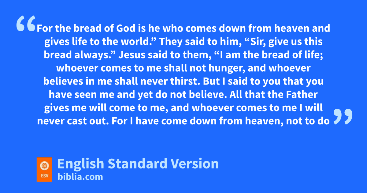 35 Jesus said to them, x“I am the bread of life; ywhoever comes to me shall not hunger, and whoever believes in me shall never thirst. 36 But I said to you that you have seen me and yet do not believe. 37 zAll that athe Father gives me will come to me, and bwhoever comes to me I will never cast out. 38 For cI have come down from heaven, not to do dmy own will but dthe will of him ewho sent me. 39 And fthis is the will of him who sent me, gthat I should lose nothing of hall that he has given me, but iraise it up on the last day. 40 For this is the will of my Father, that everyone who jlooks on the Son and kbelieves in him lshould have eternal life, and I will raise him up on the last day.”
